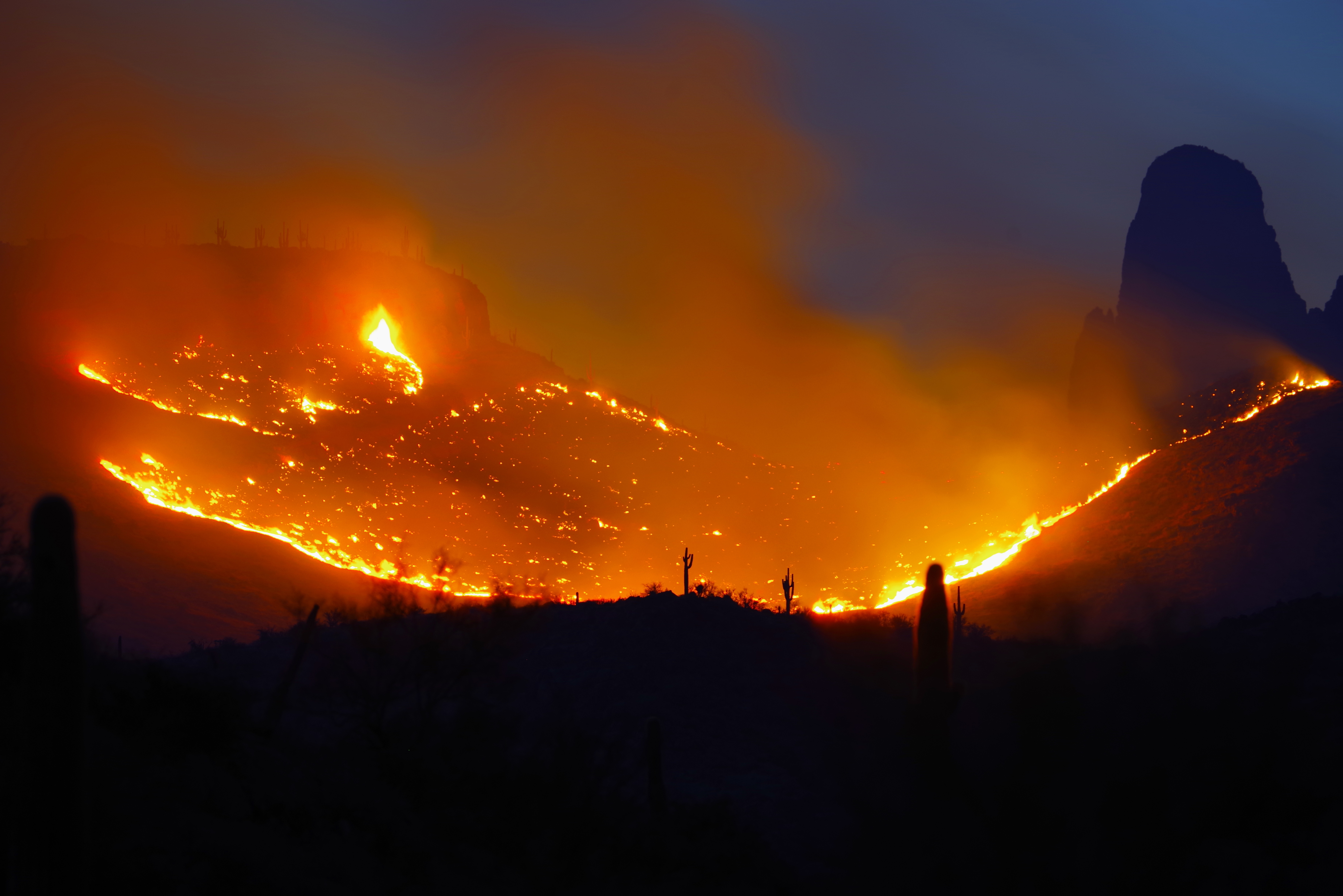 The Siphon Fire burns in The Superstition Mountains below Weavers Needle.