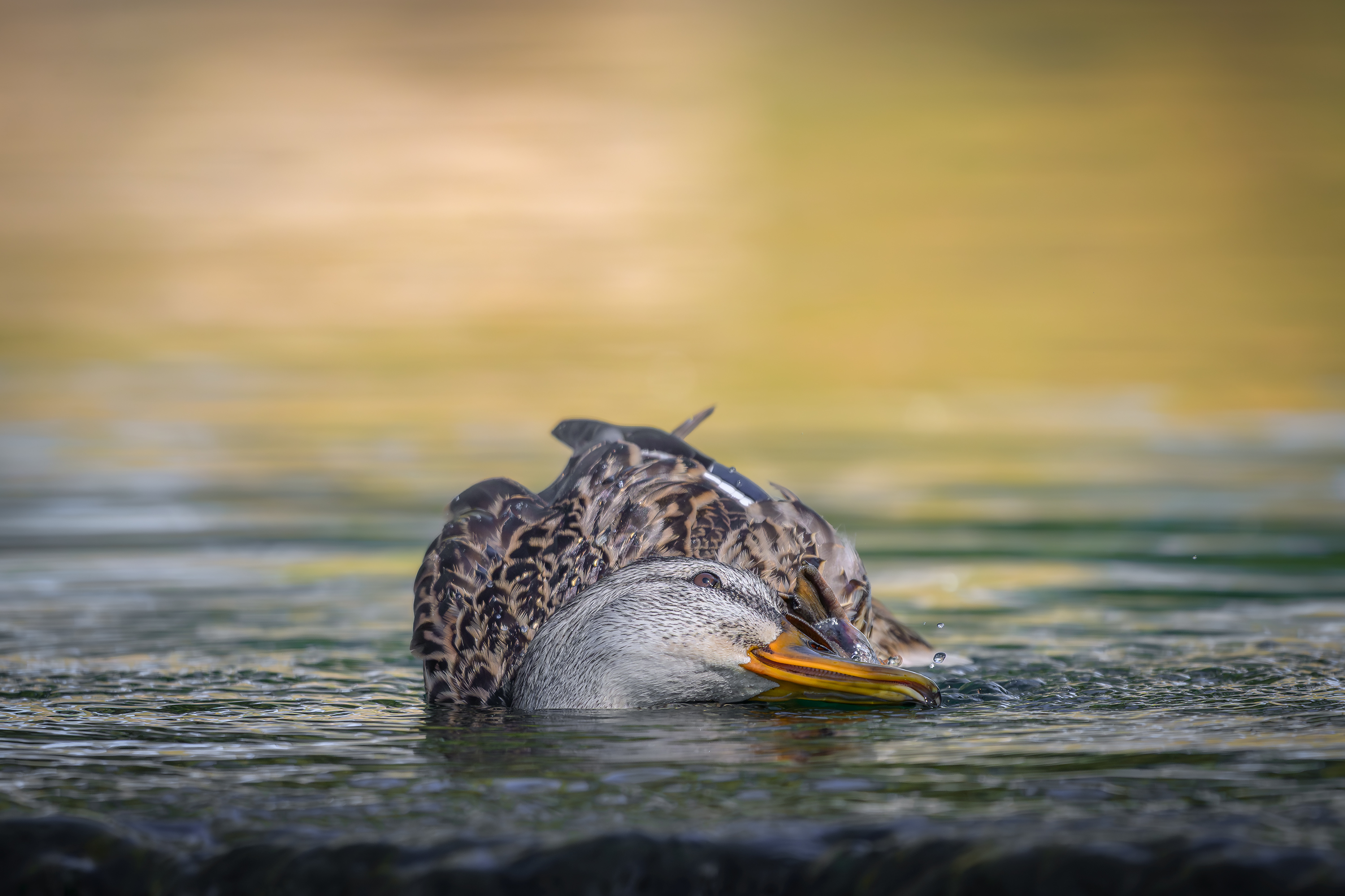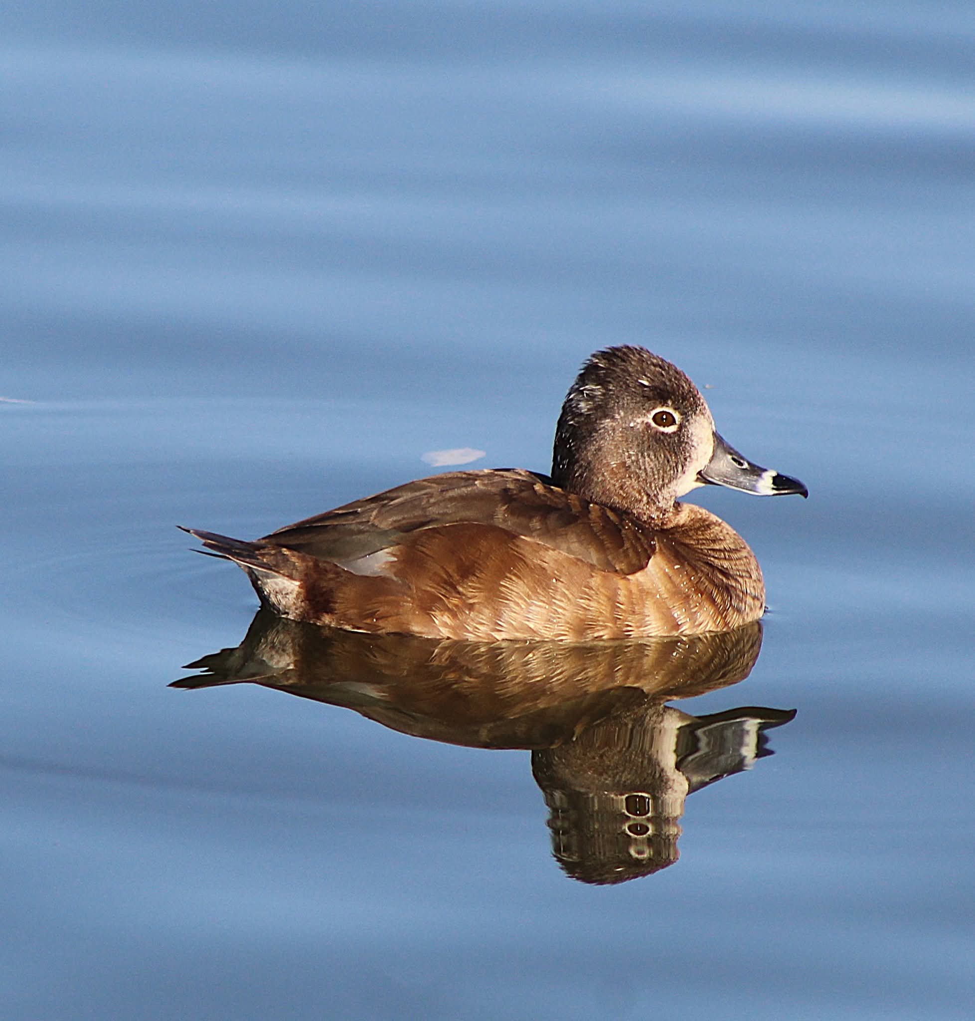 A female Ring Necked Duck is also reflected in the waters of the fishing lake at Pioneer Park in Peoria.