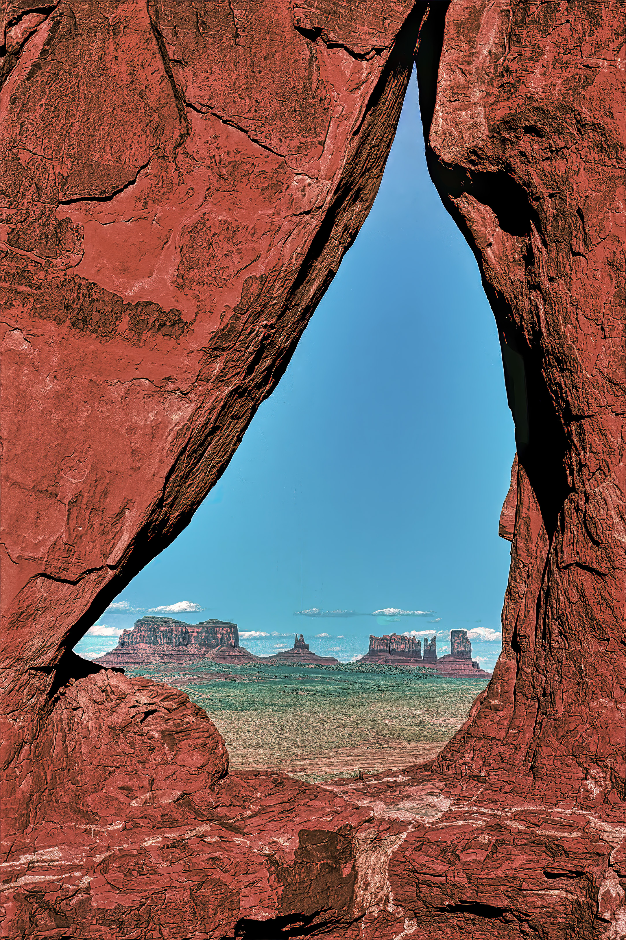 A late afternoon view of Monument Valley's buttes and spires taken through Teardrop Window.