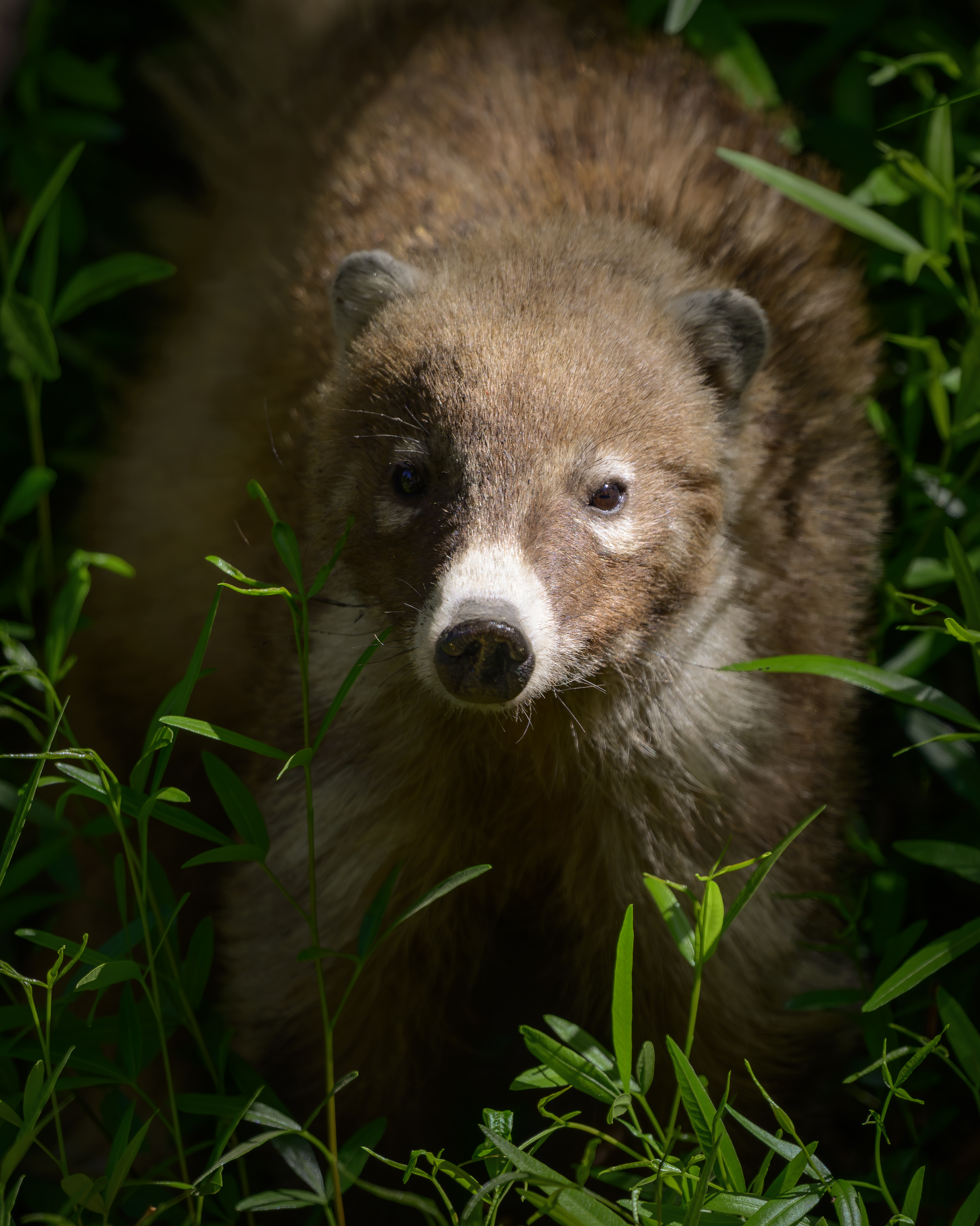 A white-nosed coati slowly emerged from the shadows of a tree to forage for food in another area.