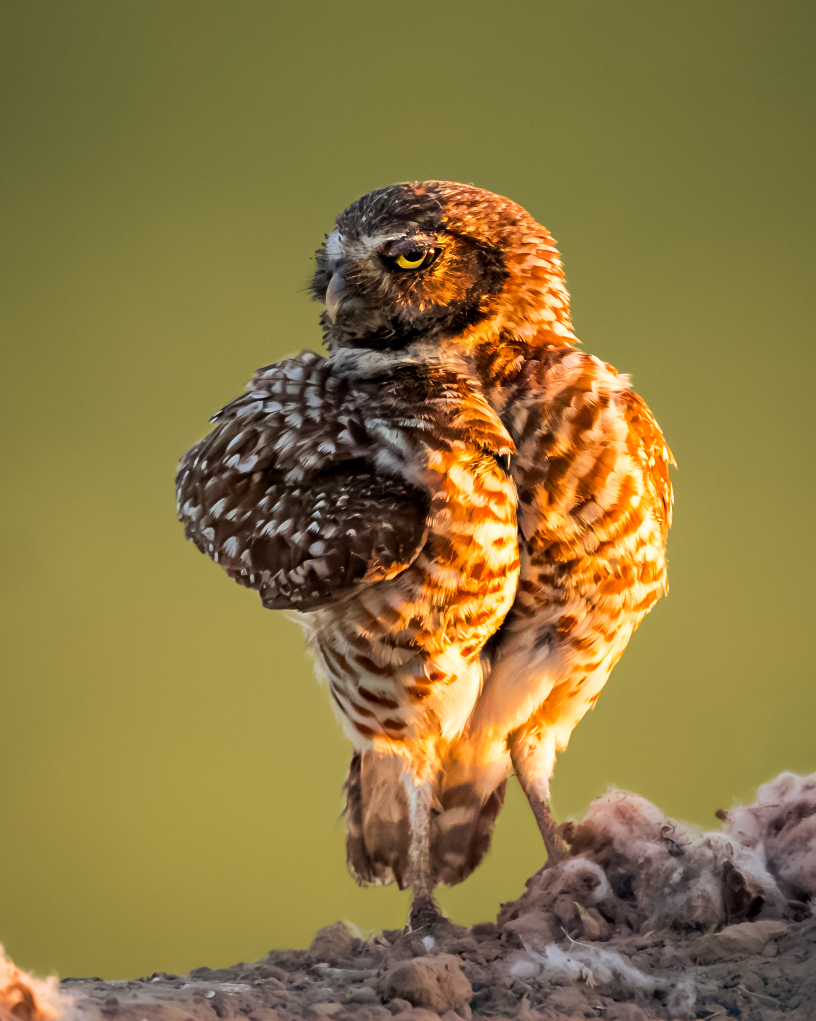 A burrowing owl struck a confident, body-building pose at sunset in the farm fields of Eloy, highlighted beautifully by the warm Arizona light.