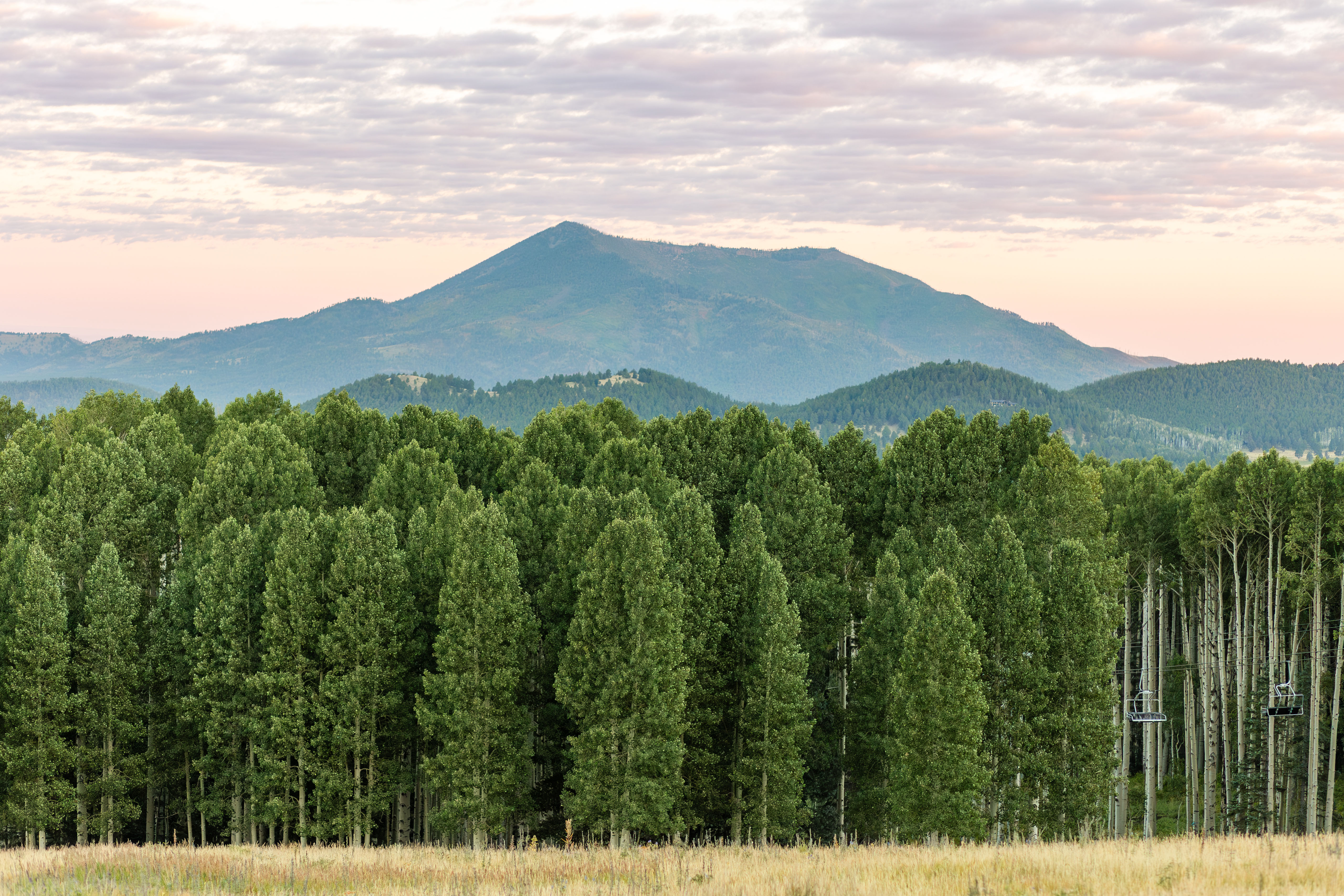 Sunrise colors light-up the clouds in soft pink and purple hues. View from a meadow, facing a towering peak above emerald green Aspens near Arizona Snowbowl.