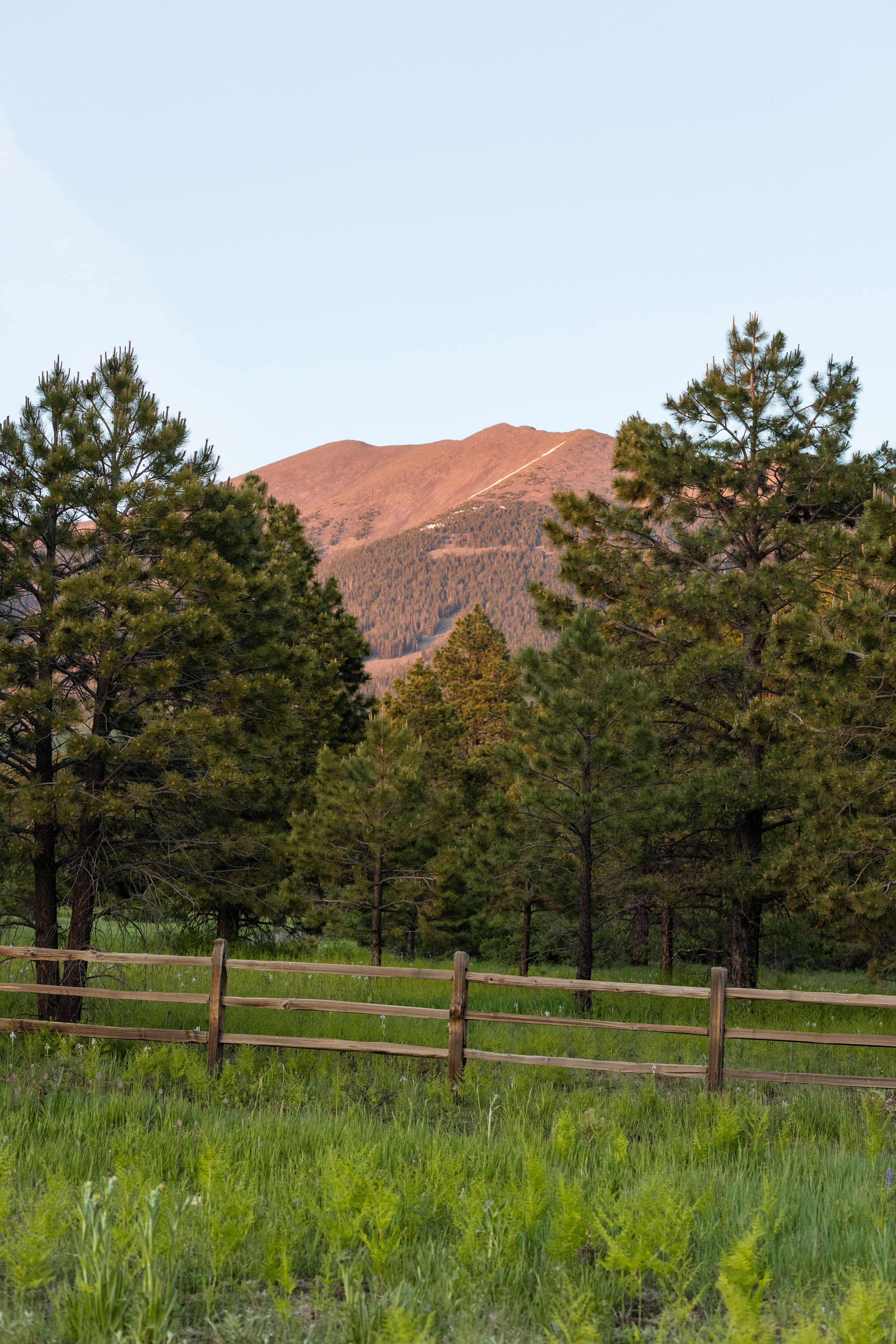 View of the San Francisco Peaks lit purple by sunset off of FR 151 near Flagstaff, Arizona.