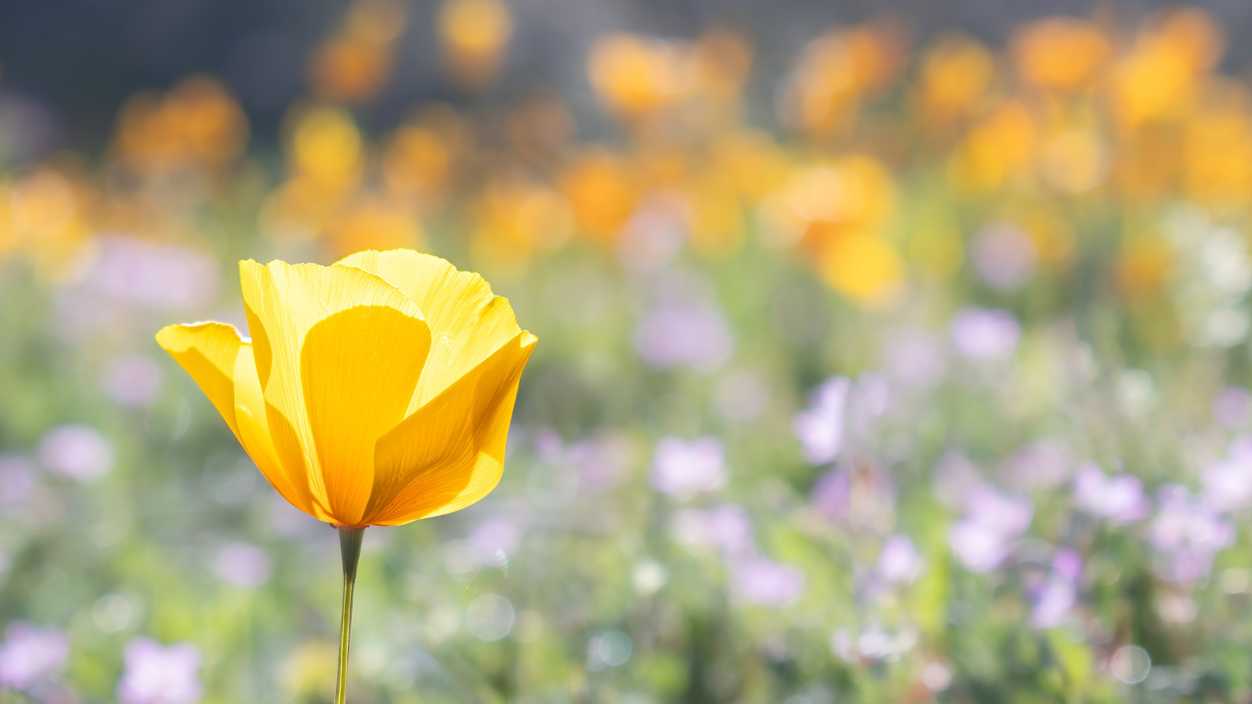 A single poppy stands tall among a superbloom of yellow and purple wildflowers in the Tonto National forest