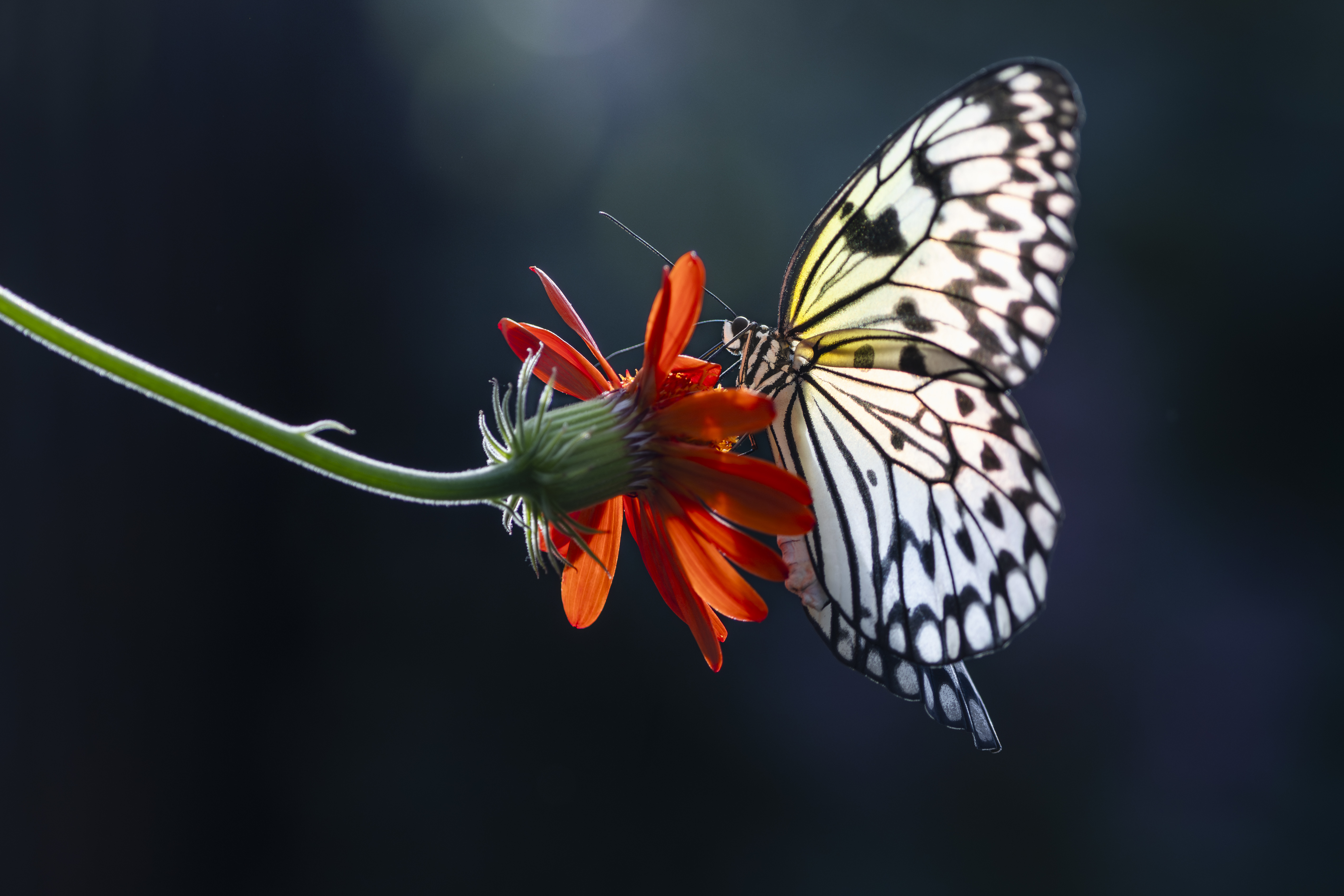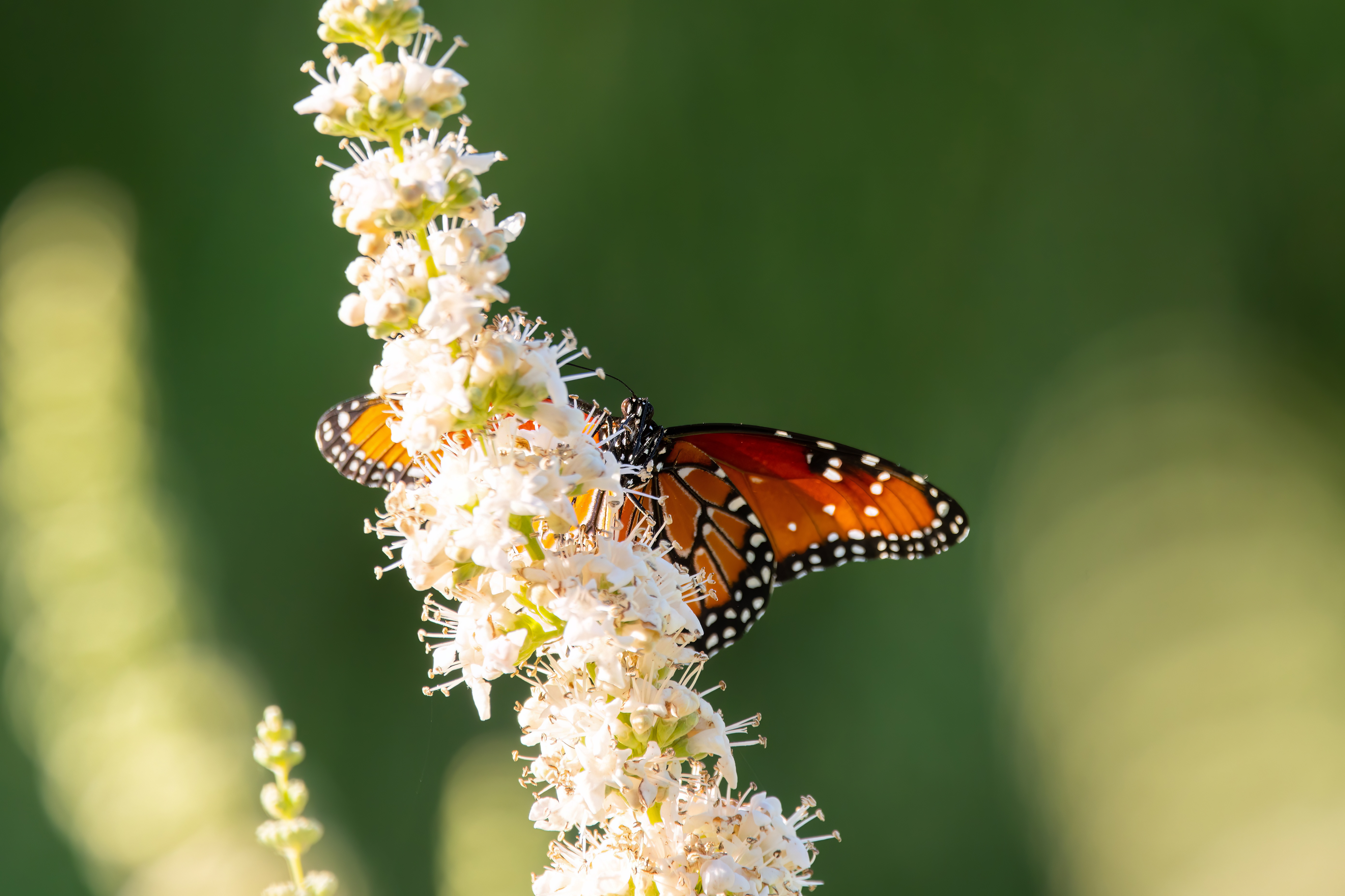A Queen Butterfly stops for a meal on a beautiful white flowering plant