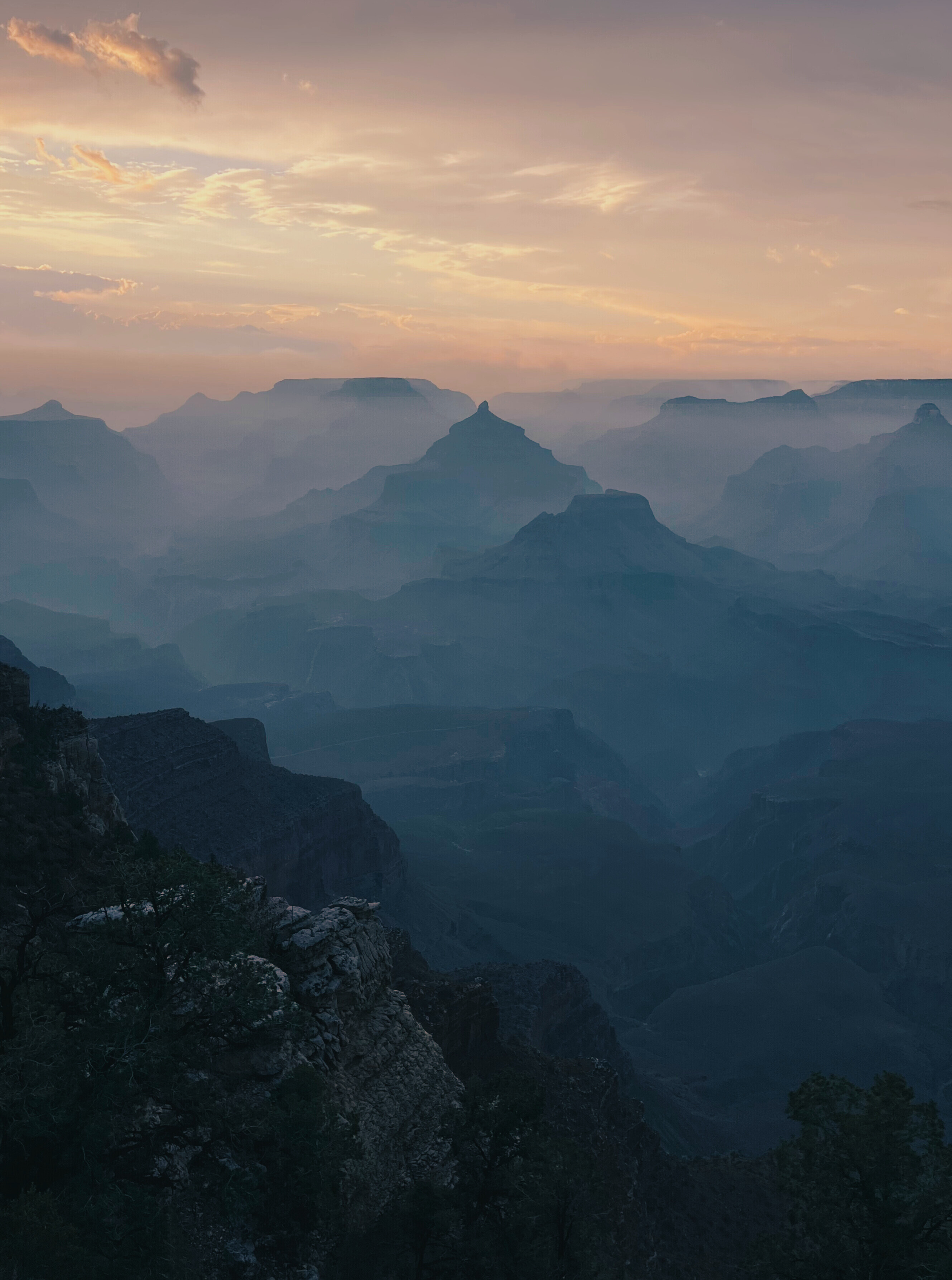 Moments before dusk at Mather Point where Dragon Bravo wildfire smoke settled in the canyon.