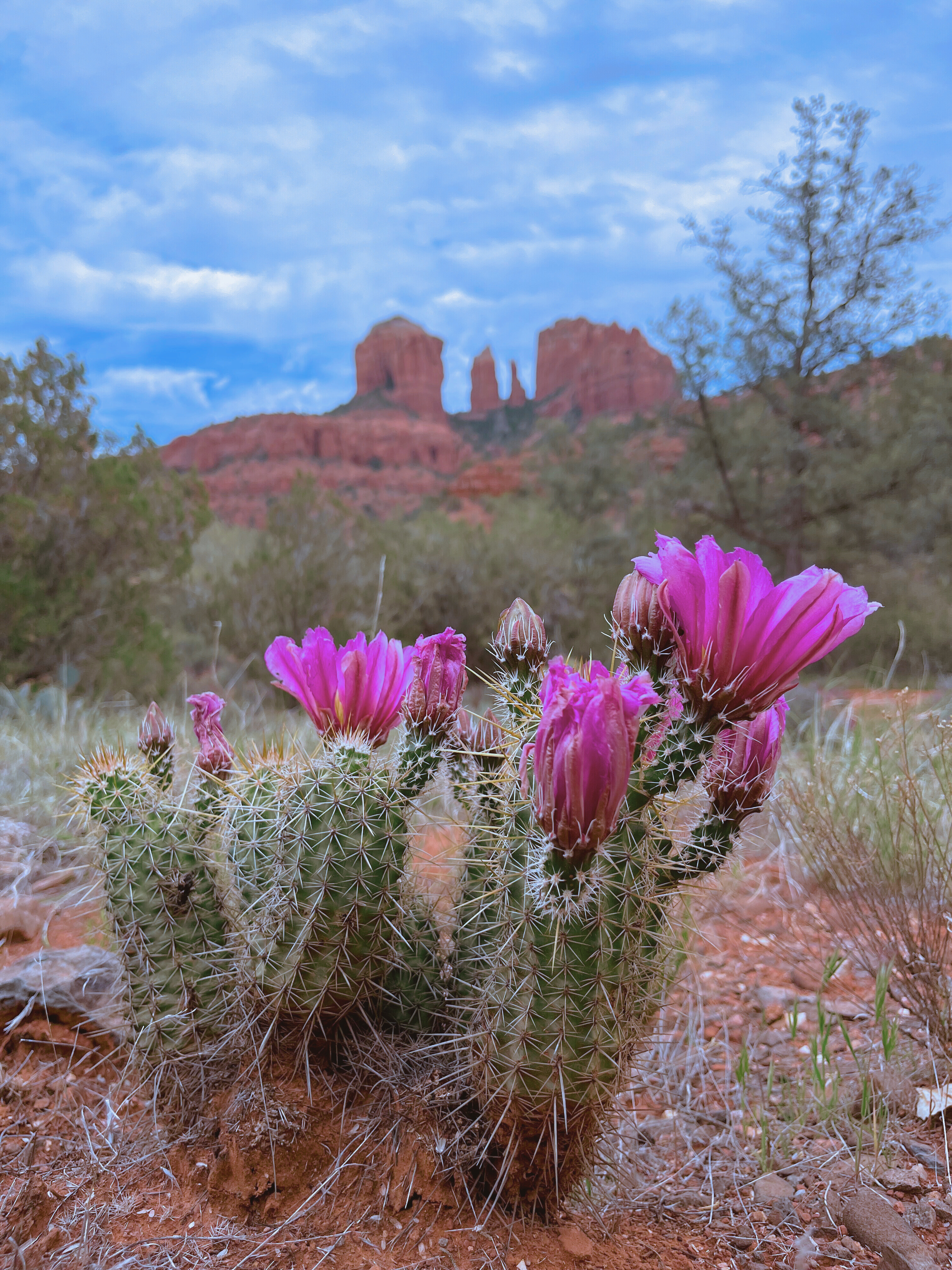 A hedgehog cactus bloom mirrors the Cathedral Rock butte.