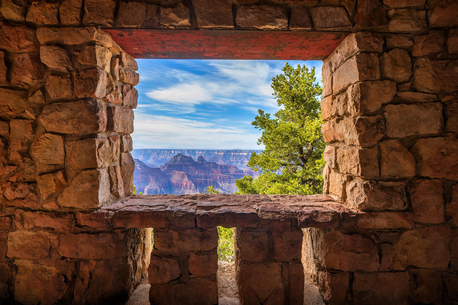 "Portal to the Peaks: Morning Light (Horizontal):" Morning light transforms Angel’s Window on the North Rim of the Grand Canyon into a new experience.