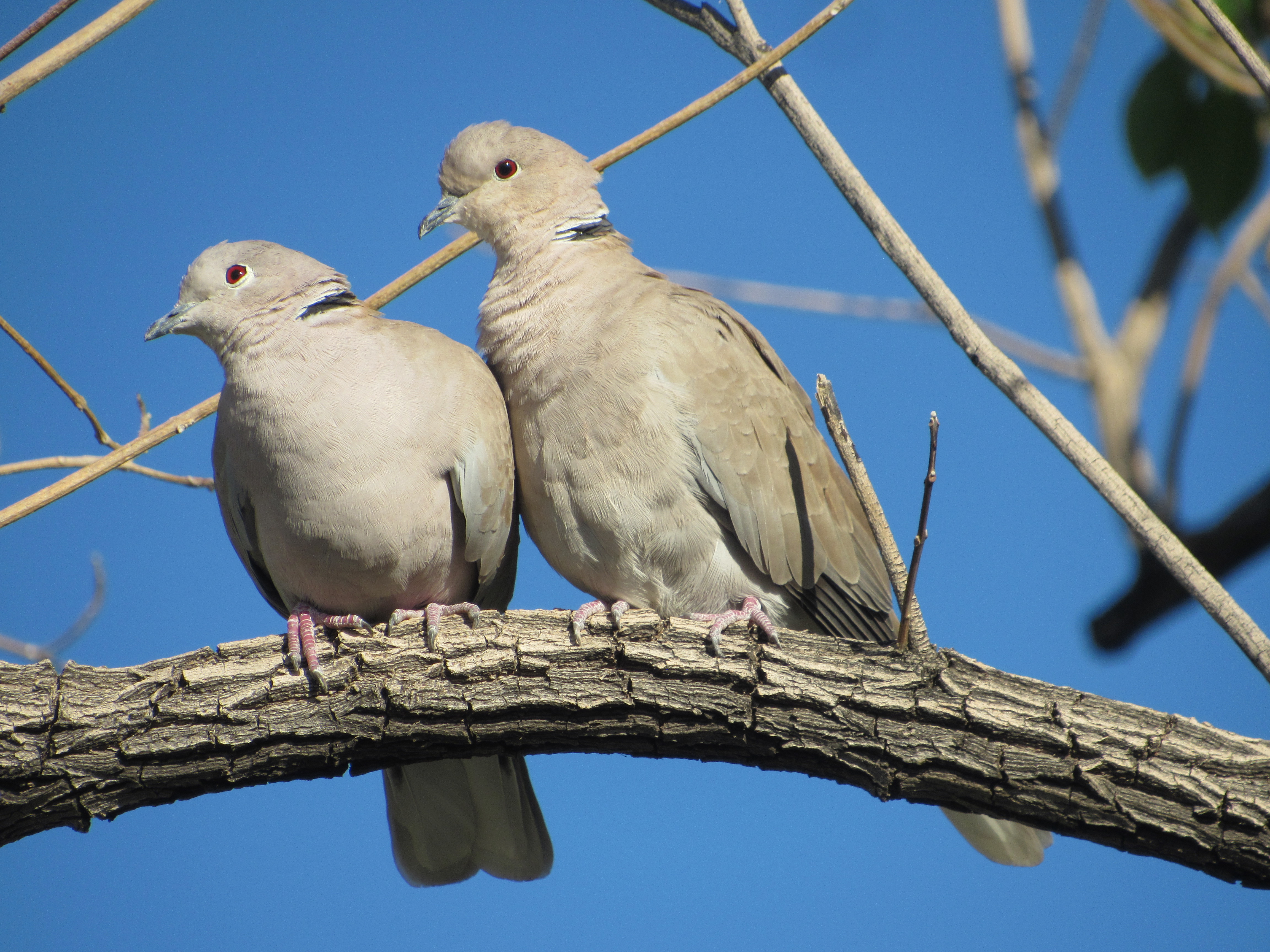 A pair of Eurasian Collared Doves snuggle in a tree at our apartment complex.