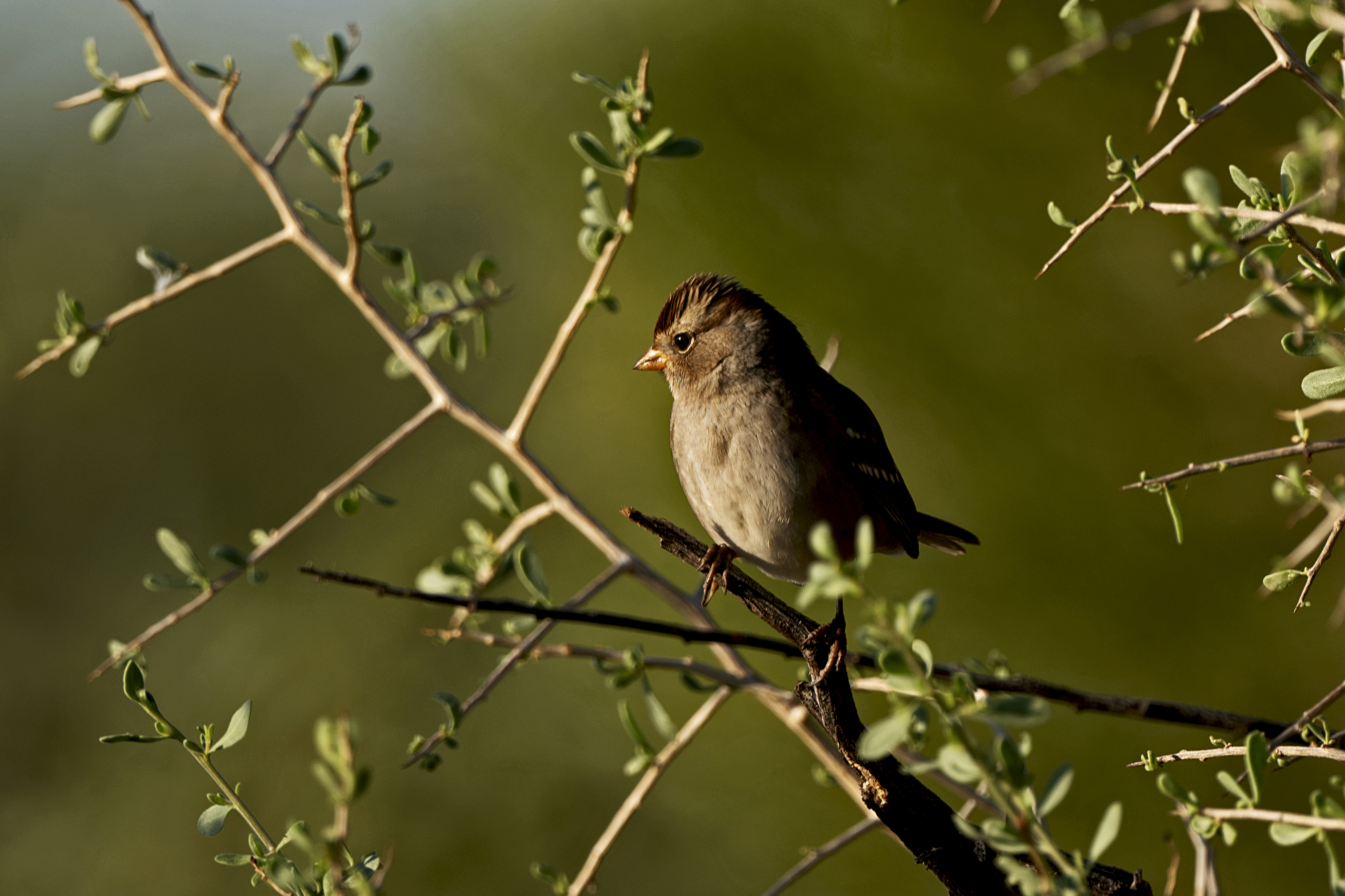 Cute sparrow watching everything from a high branch of tree in Riparian Preserve.