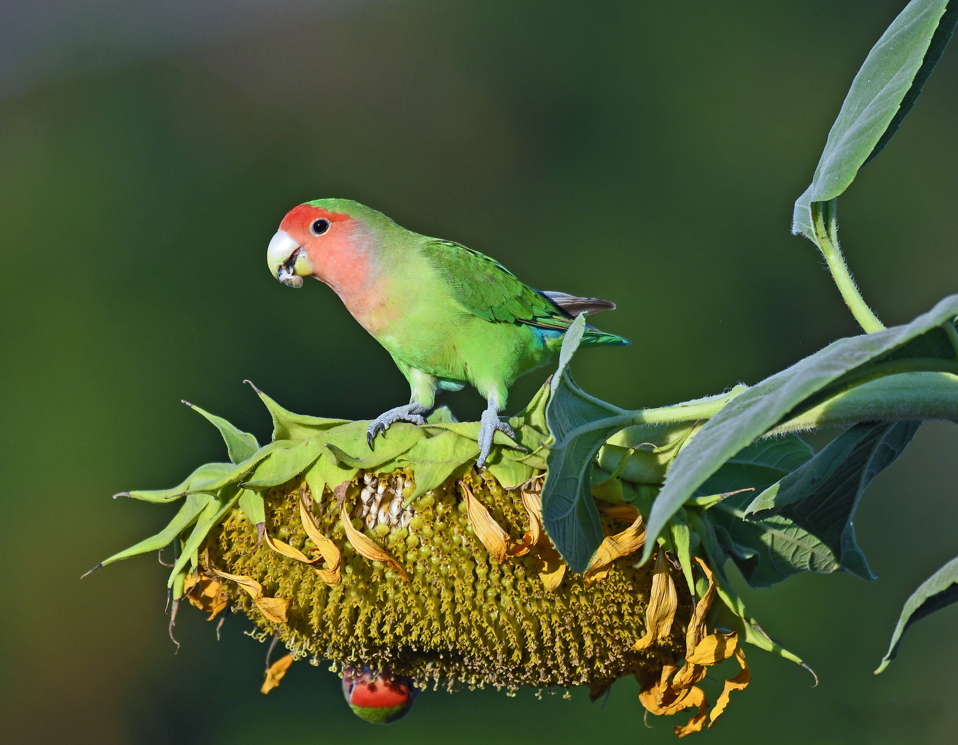Rosy-faced Lovebirds enjoy sunflower seeds from a Giant Sunflower plant.