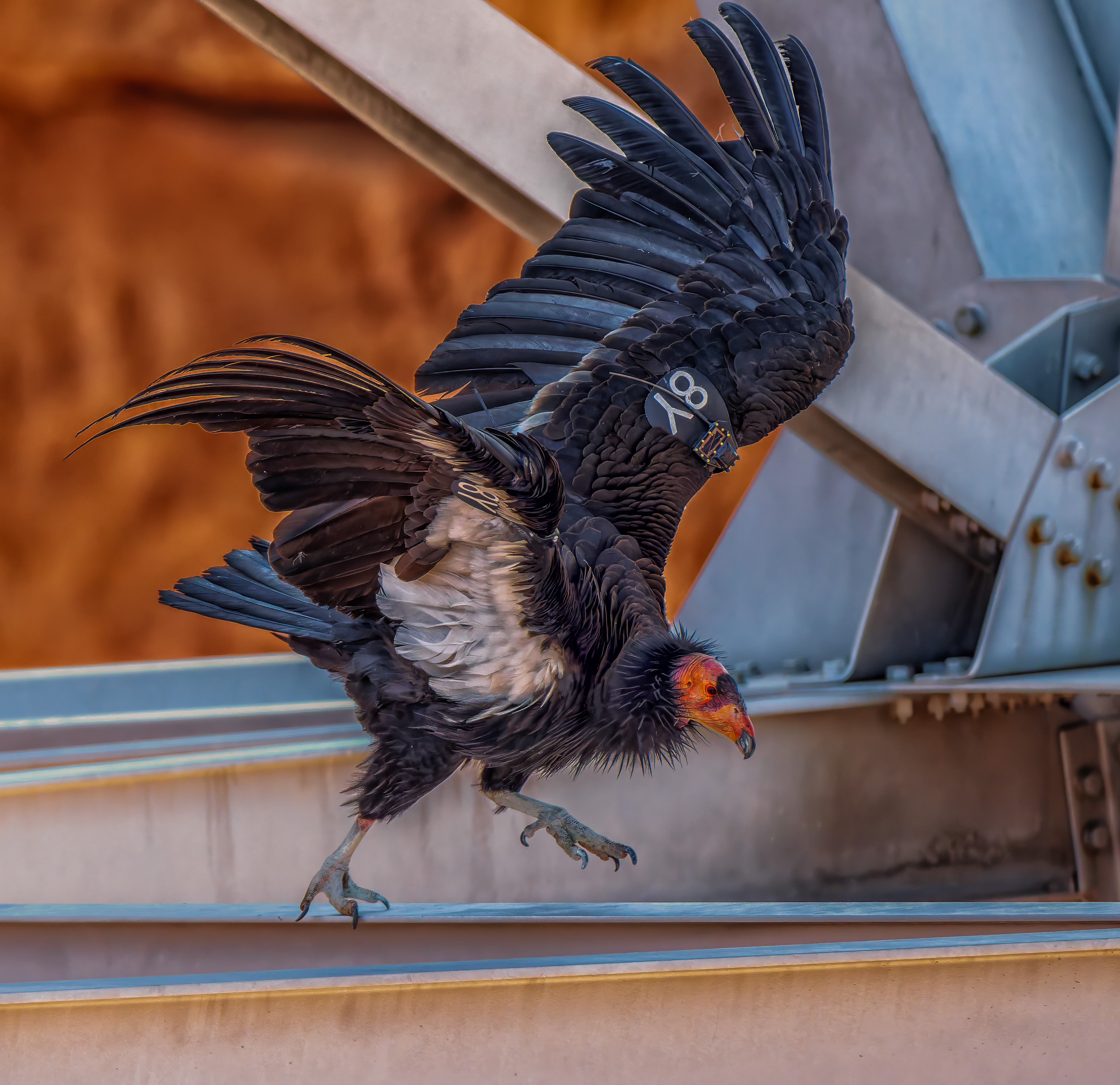 A California Condor dances across the beams of the Navajo Bridge