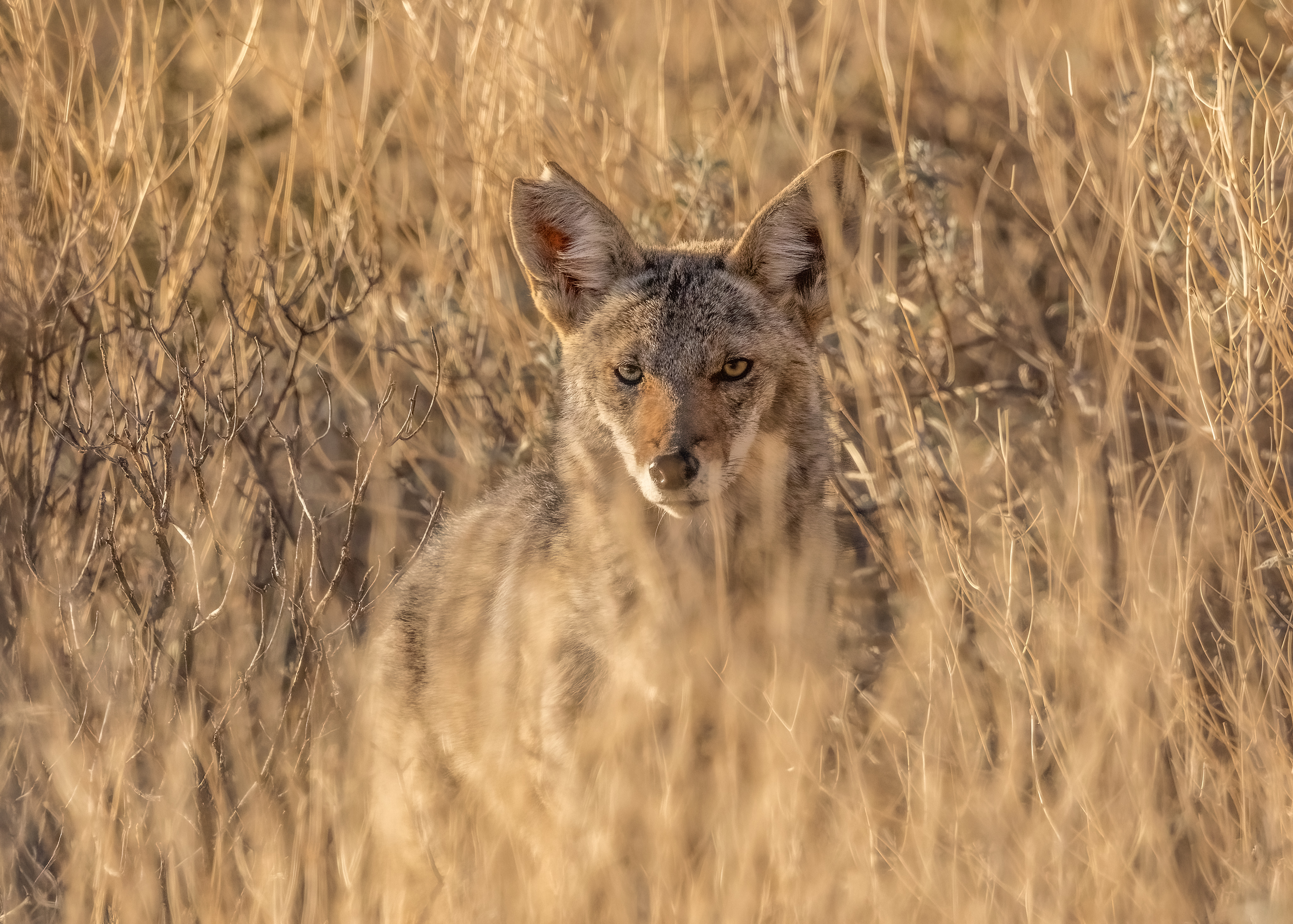A young coyote lies in wait for an evening meal to wonder by.