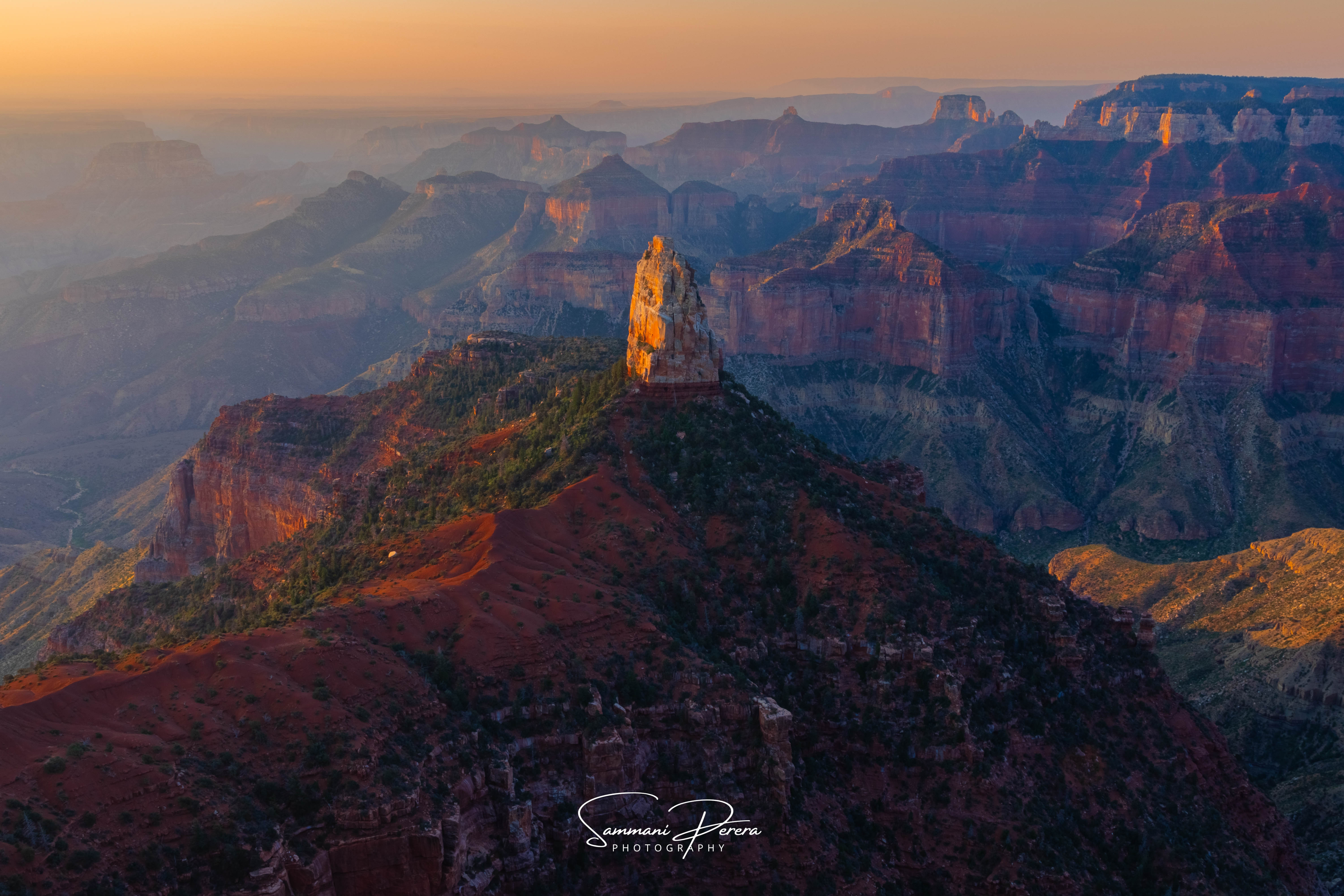 A Bright Morning. Underneath the gloom of a wildfire on the South Rim was a bright morning with a view of Deva, Brahma, and Zoroaster Temples flanking the Bright Angel Canyon.