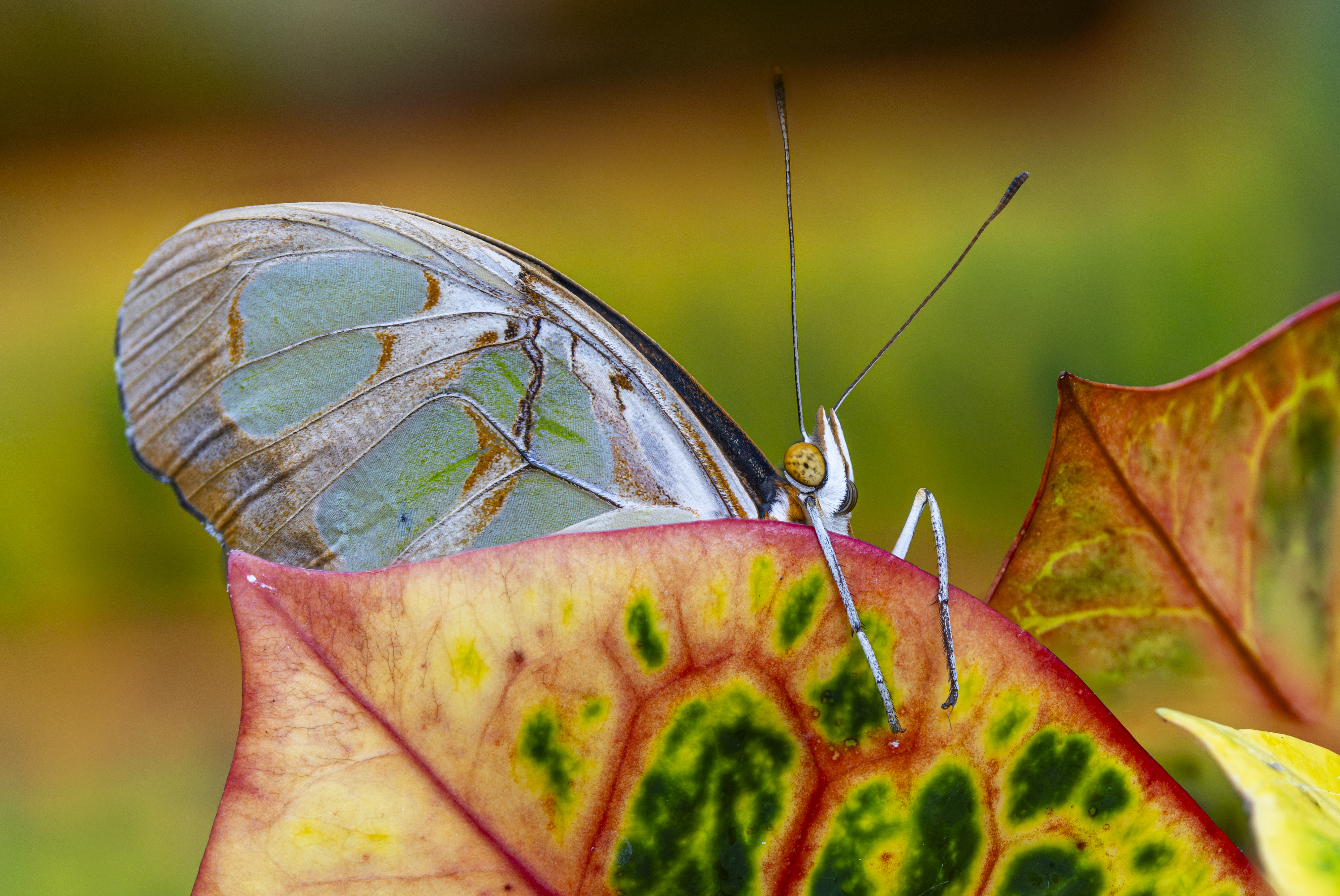 Malachite butterfly peeking over a leaf