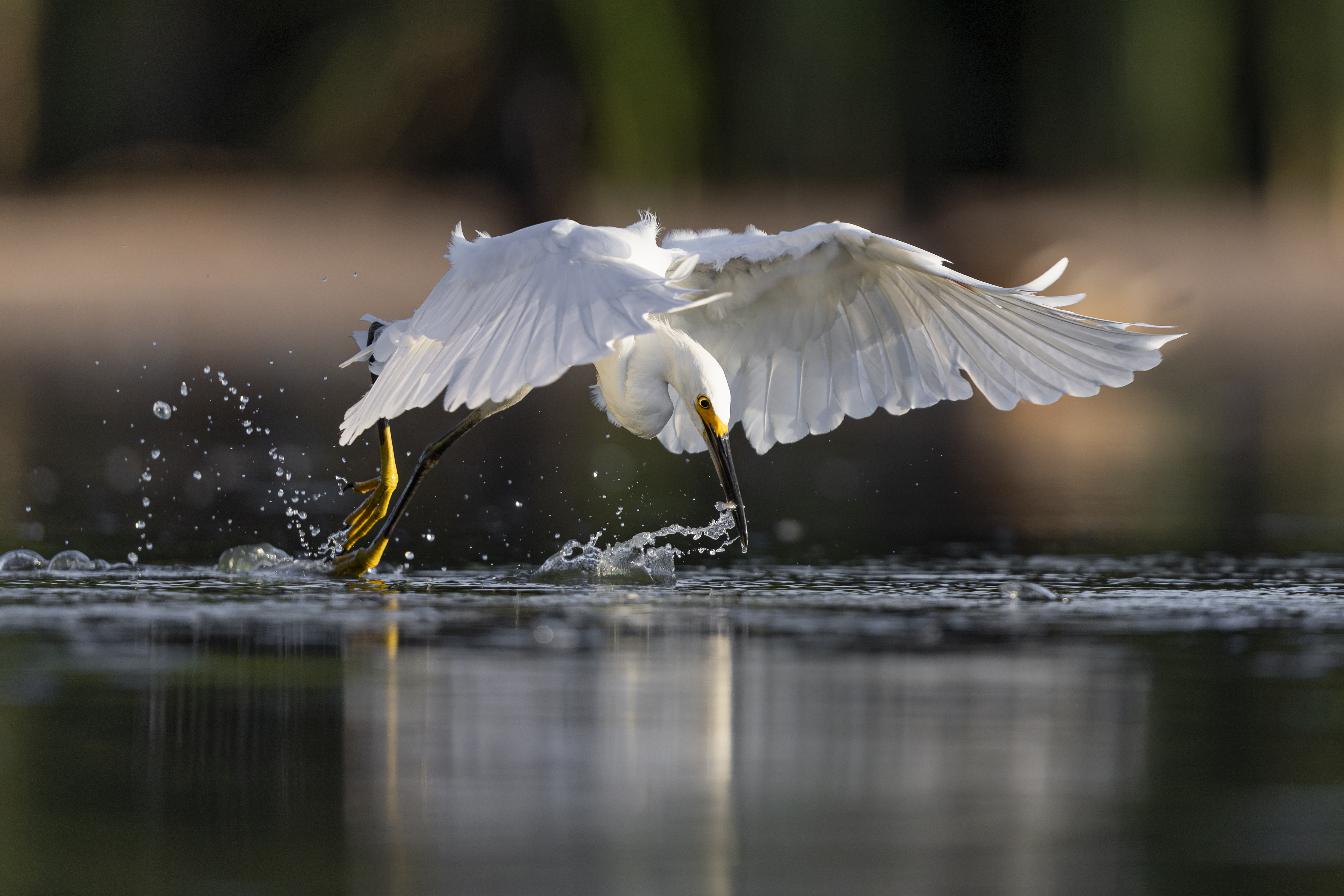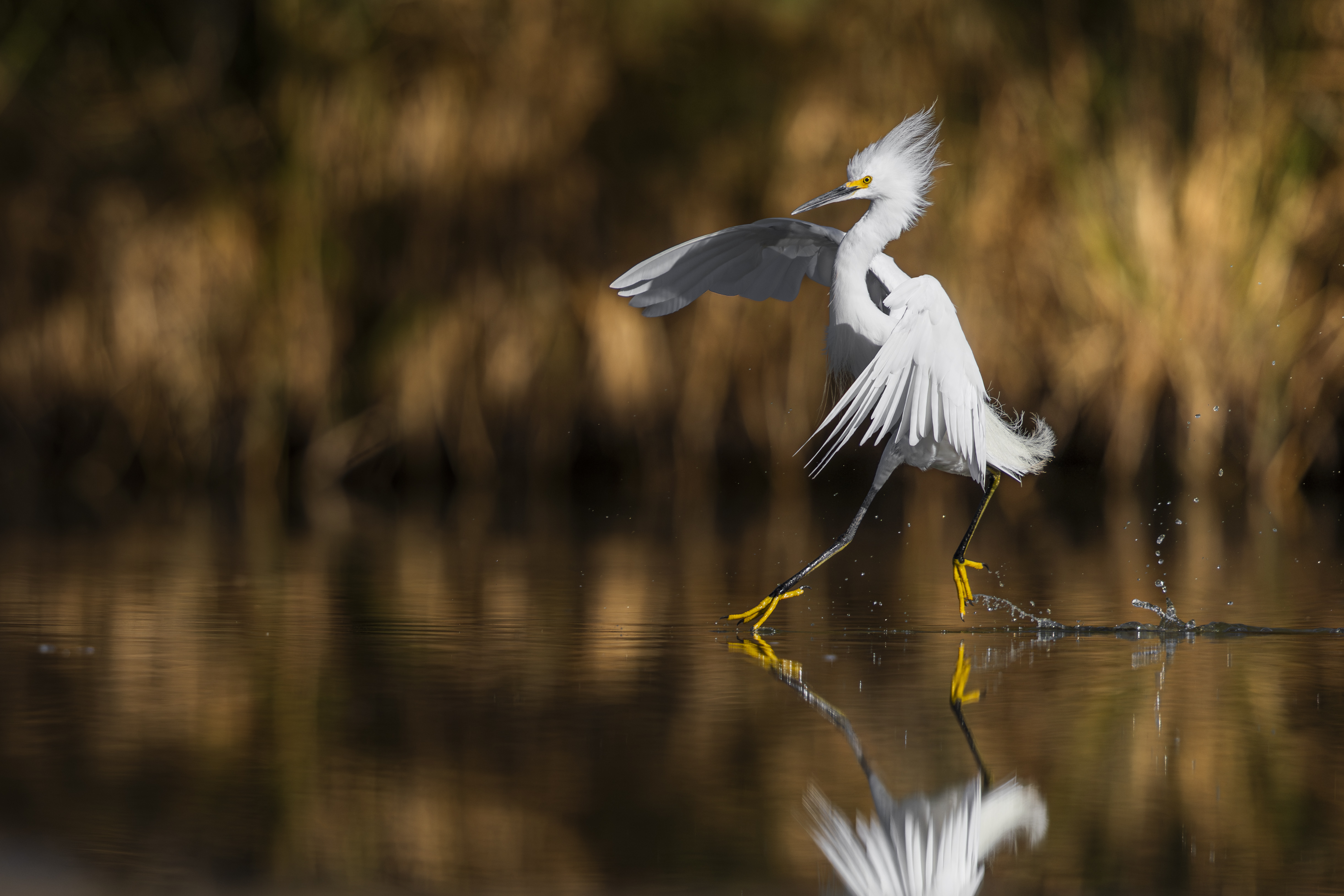 Snowy egret running across the top of the water after snatching a small fish