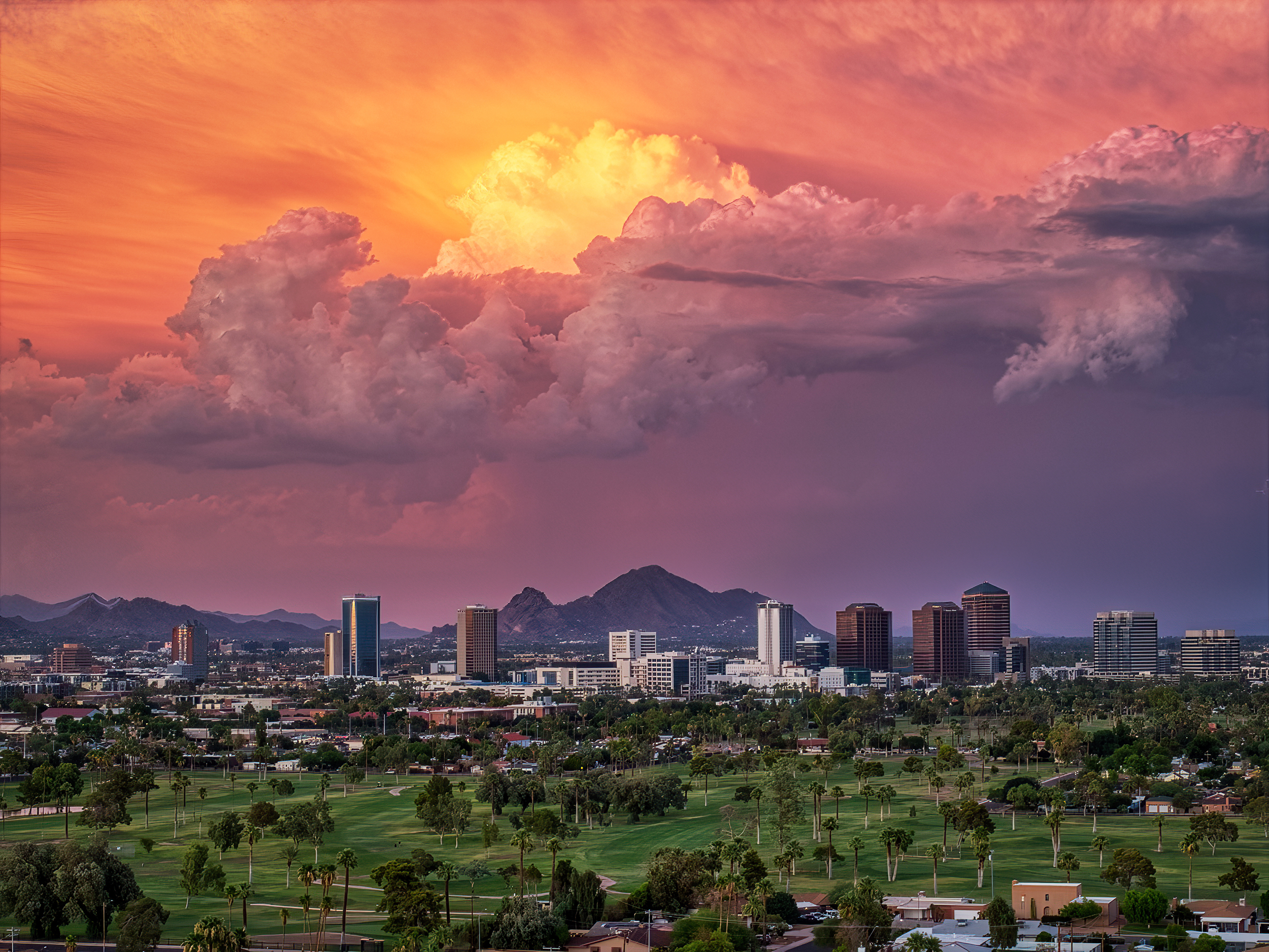 Sunset shot taken from central Phoenix overlooking Encanto Golf Course, the Central Corridor, and Camelback Mountain.