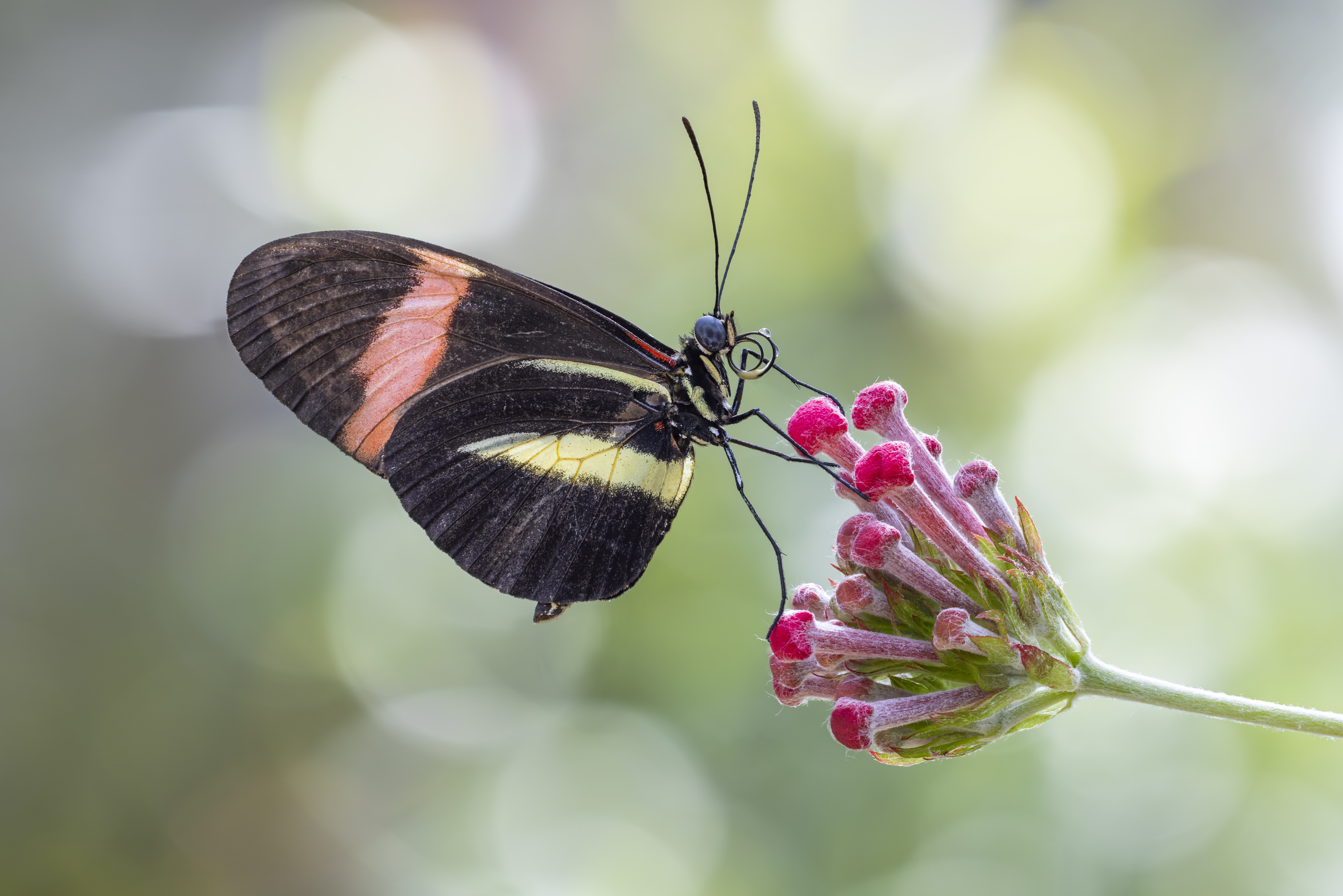 Longwing butterfly resting on a flower with a small amount of nectar still on its proboscis