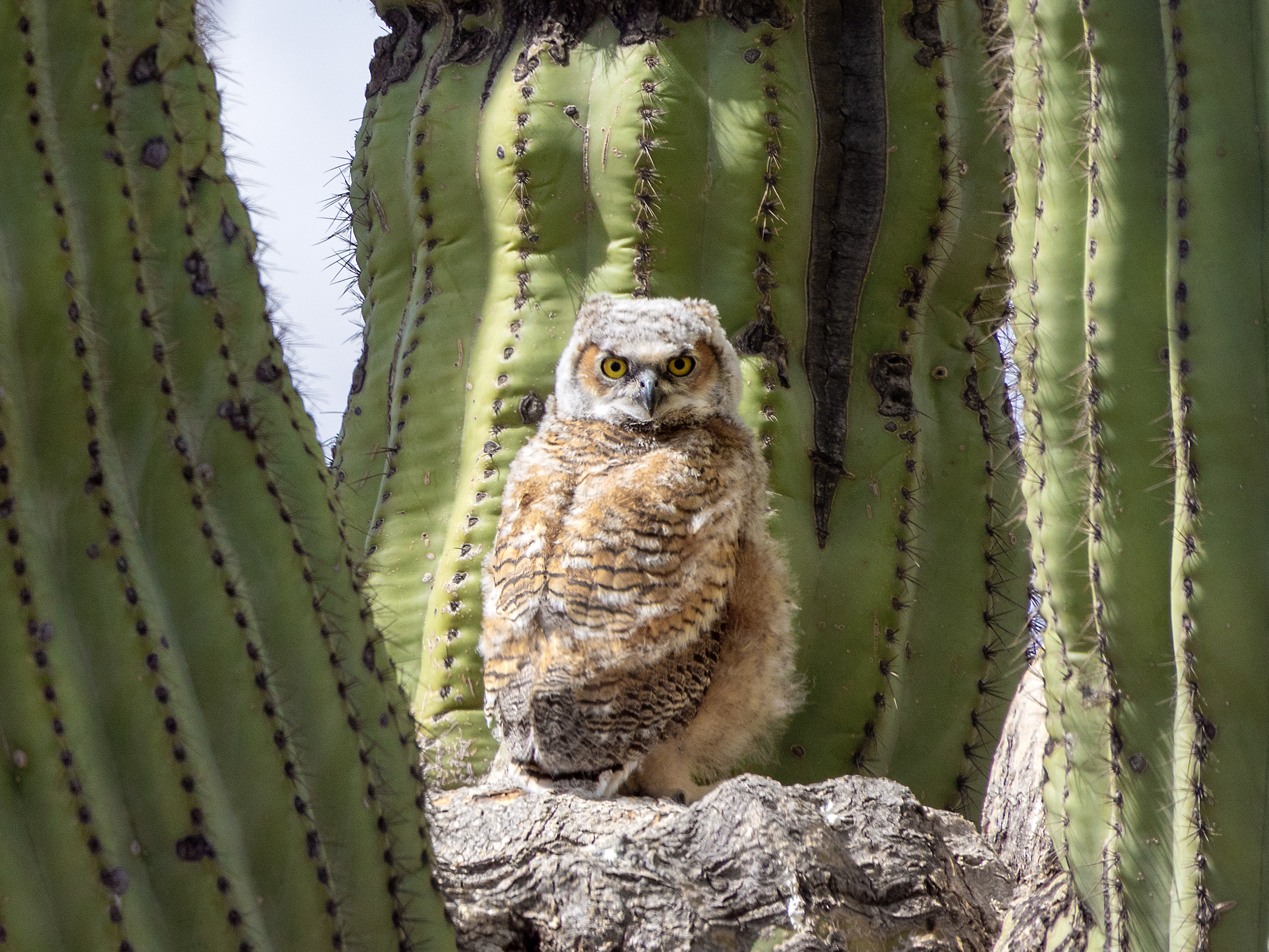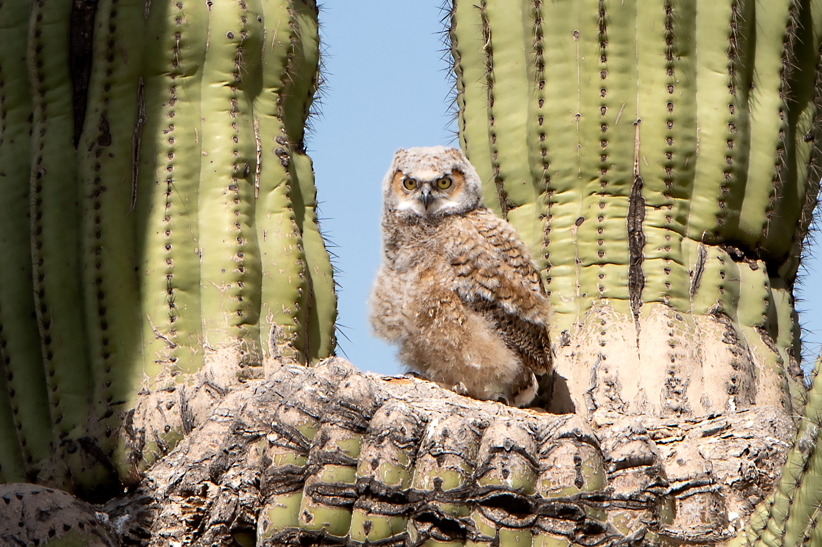 A fledgling Great Horned owl waits patiently for one of its parents to return to the nest.
