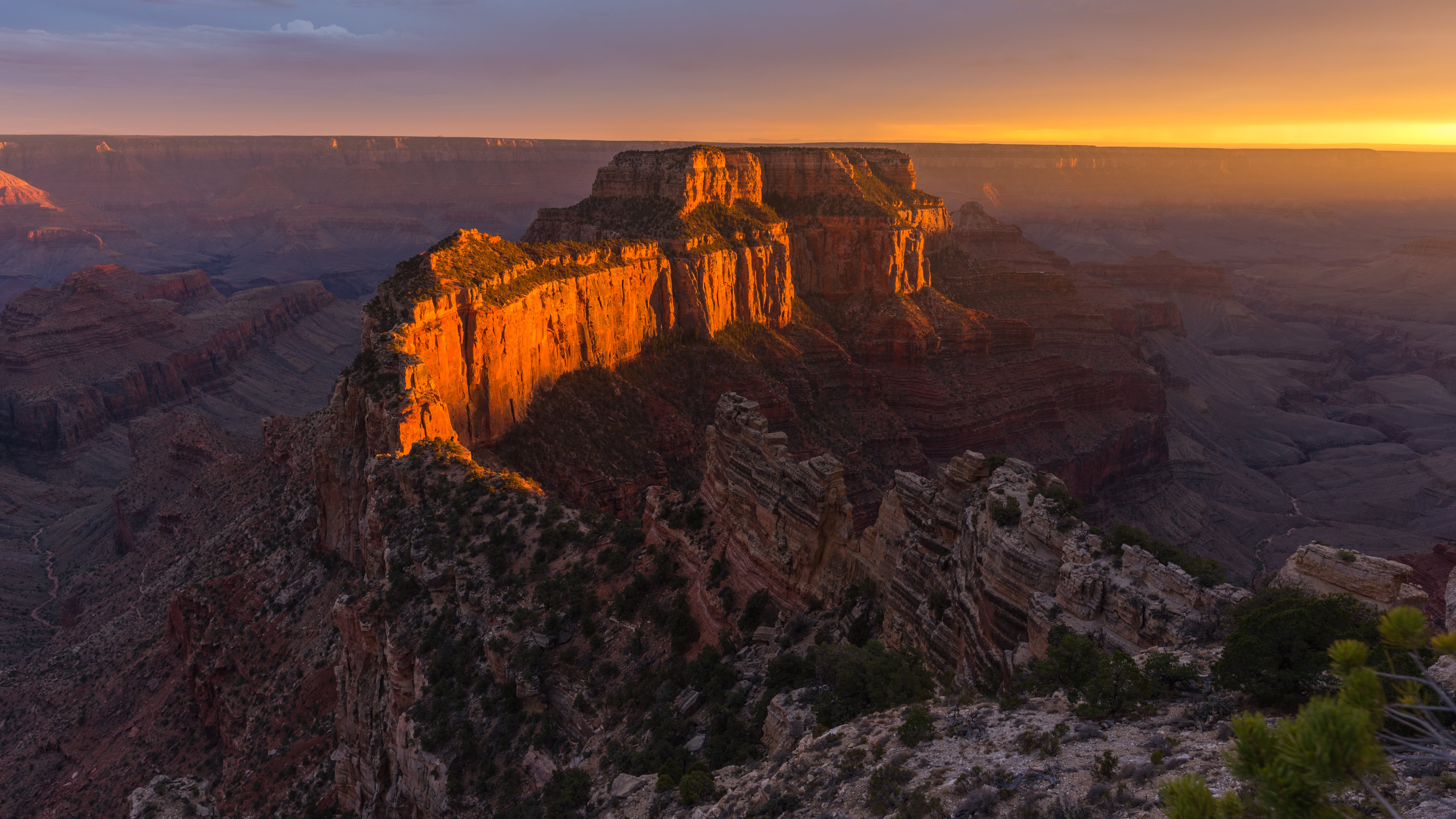 After a few days of storms the sun pierced the clouds just long enough light up Wotans Throne on our final day at the North Rim.