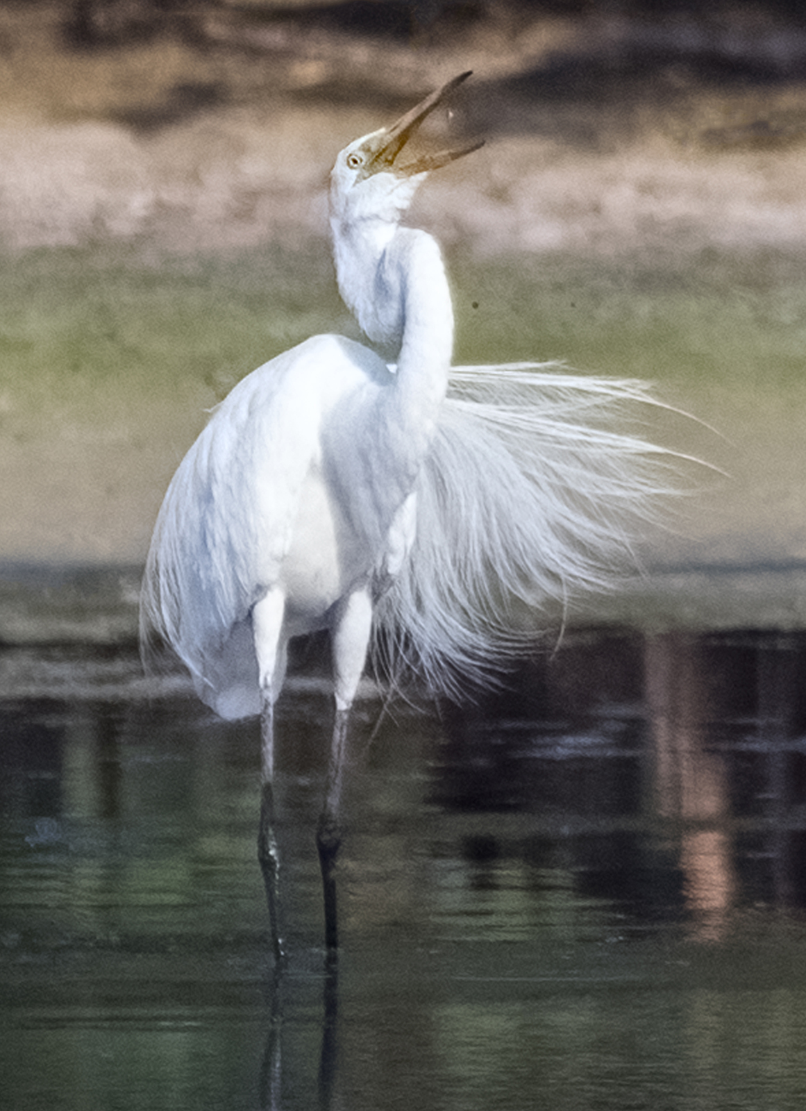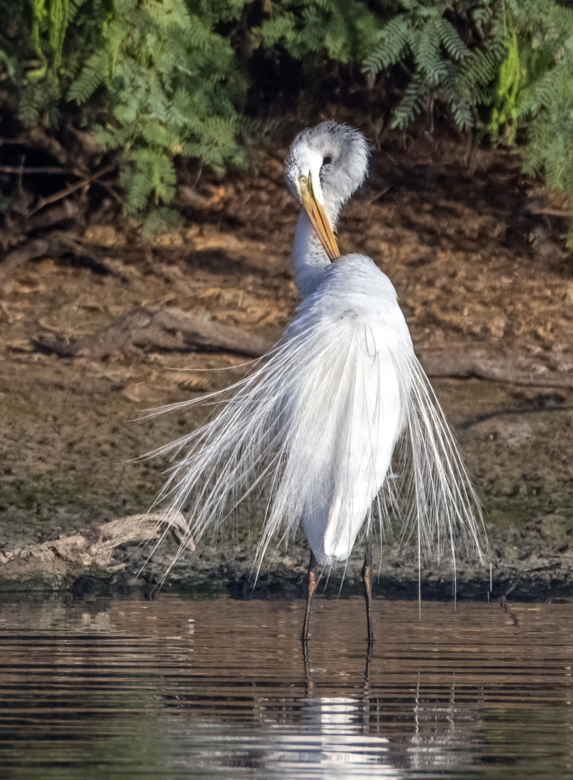 Great Egret preening its feathers. Male Great Egrets have special long feather plumes called aigrettes, which they use in courtship displays in the spring.