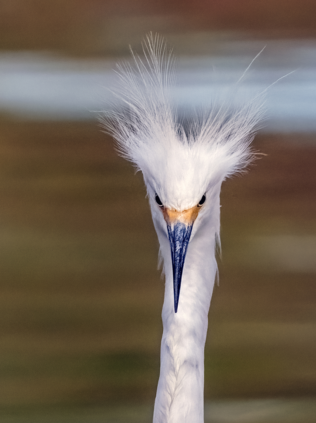 A Snowy Egret raises its head feathers in response to activity on the pond. Most likely, it was detecting another Snowy Egret heading in its direction.