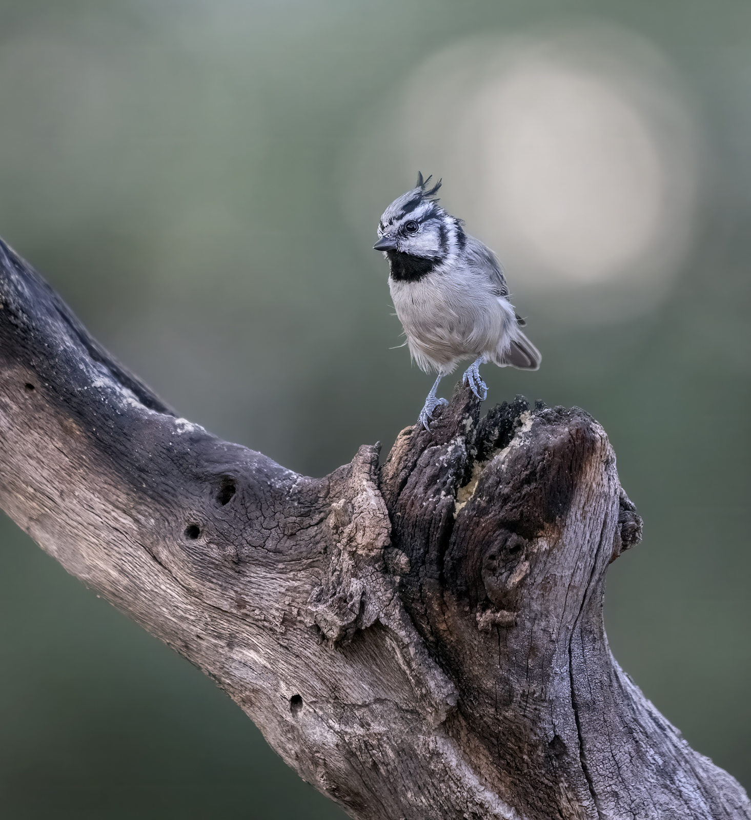 The Bridled Titmouse is a small, chickadee-like bird characterized by a small bill, a crest, and a striking head pattern.