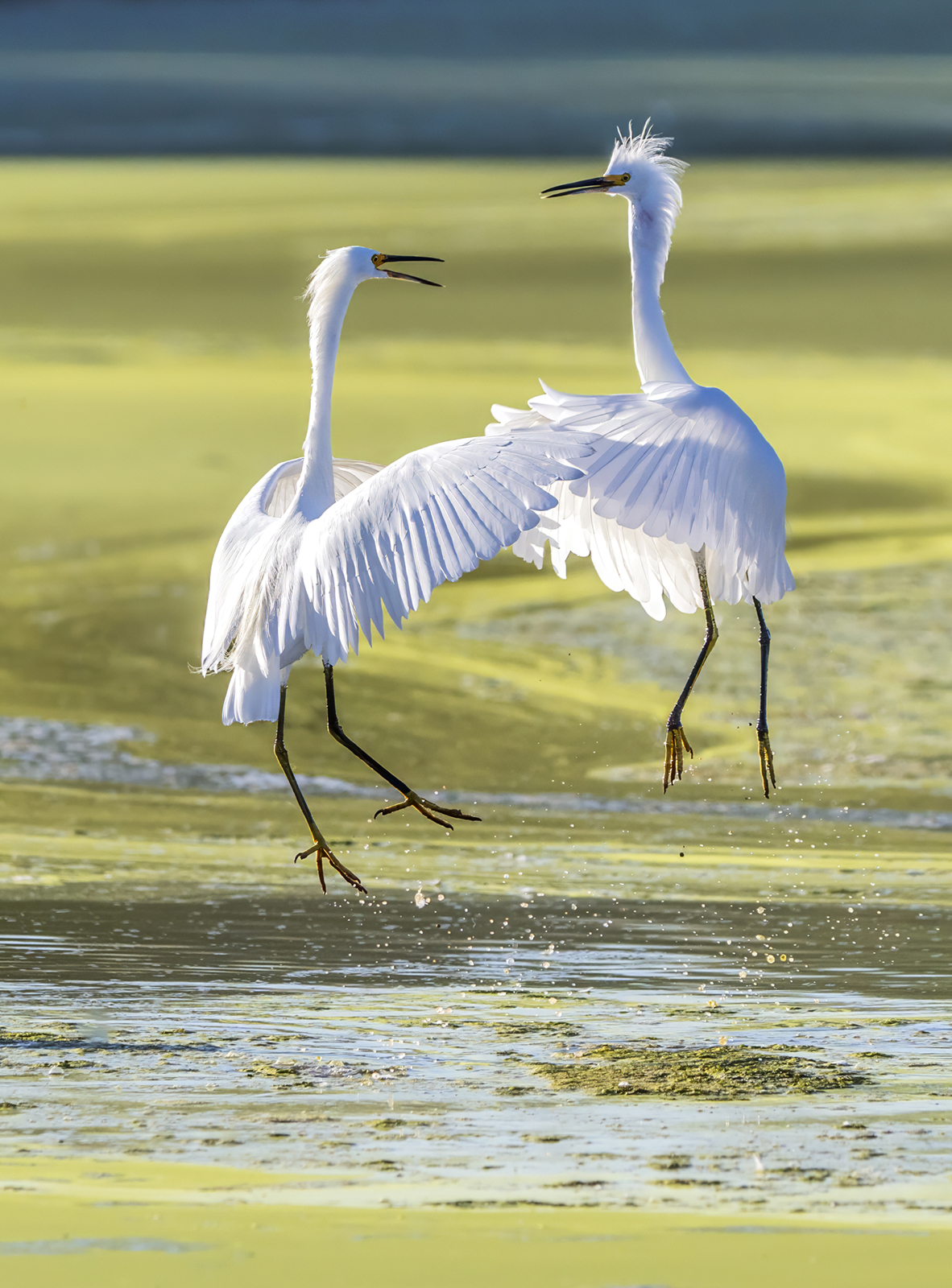 In the heat of the summer months, when algae is thick in the ponds, the Snowy Egrets still face off over a fishing spot.