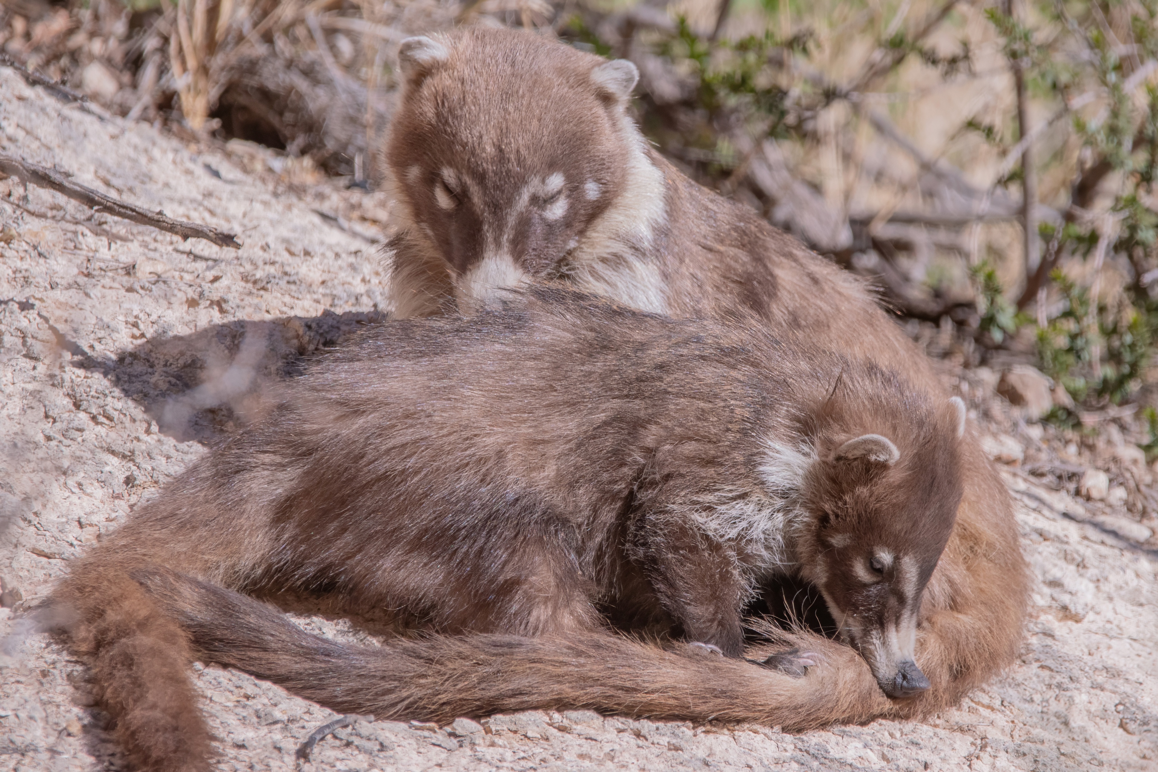 A sweet moment between a juvenile and adult white-nosed coati, with the youngster grooming the tail of the resting adult