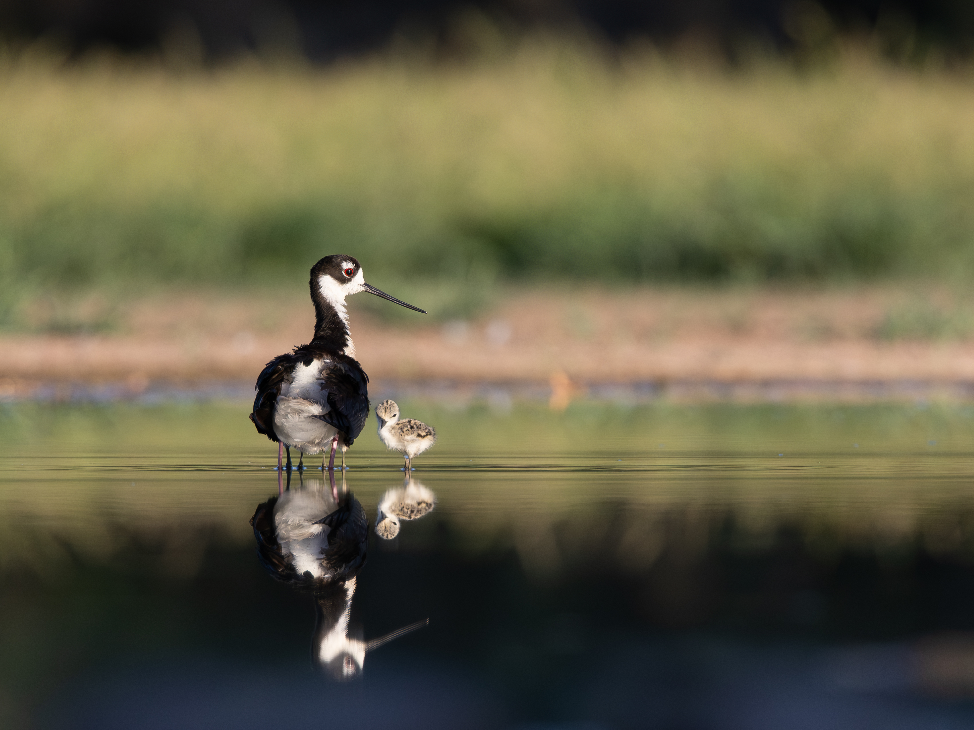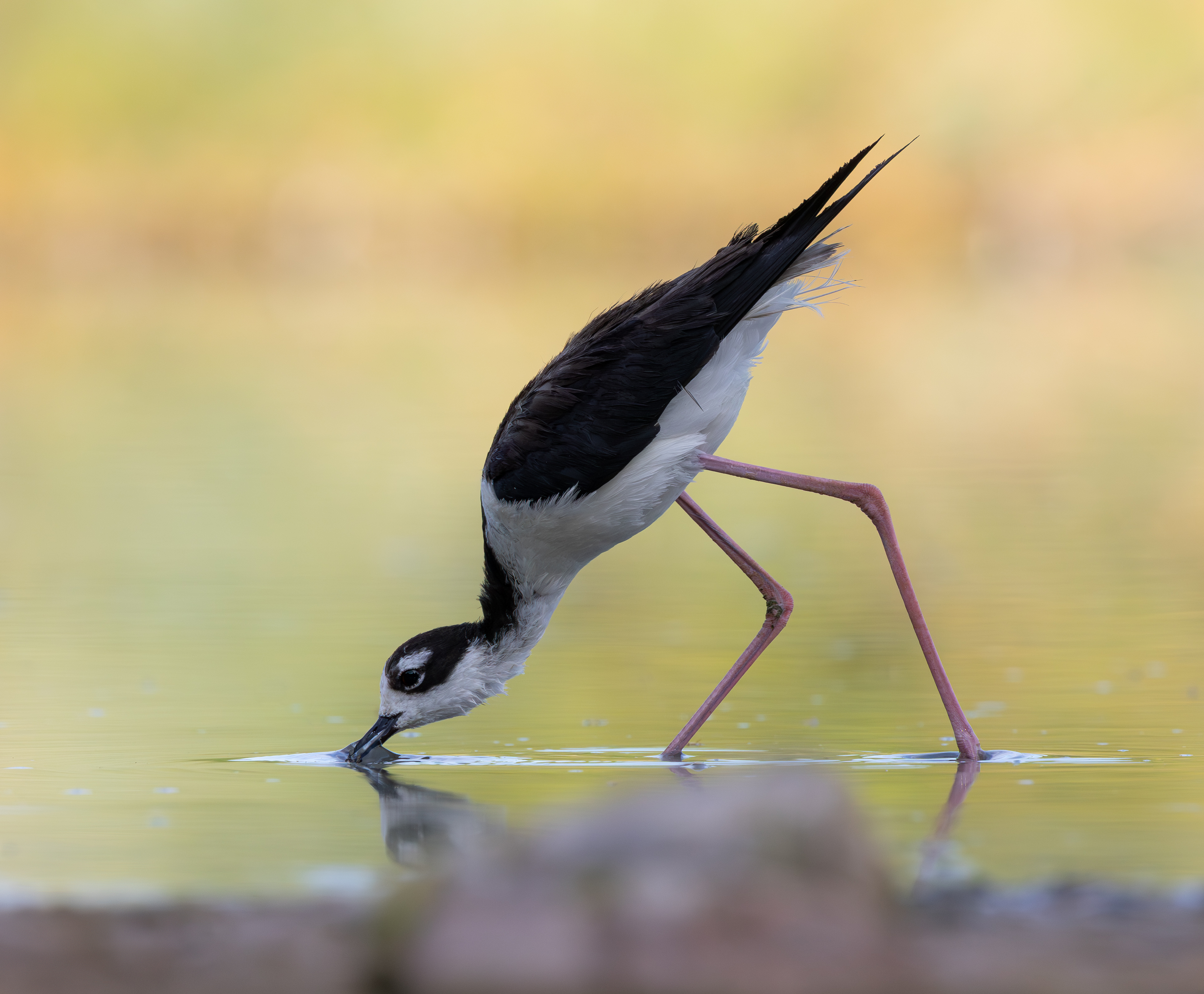 A Black-necked Stilt forages after sunrise. These beautiful shorebirds prefer low water levels and will raise families in Arizona if the conditions are right.
