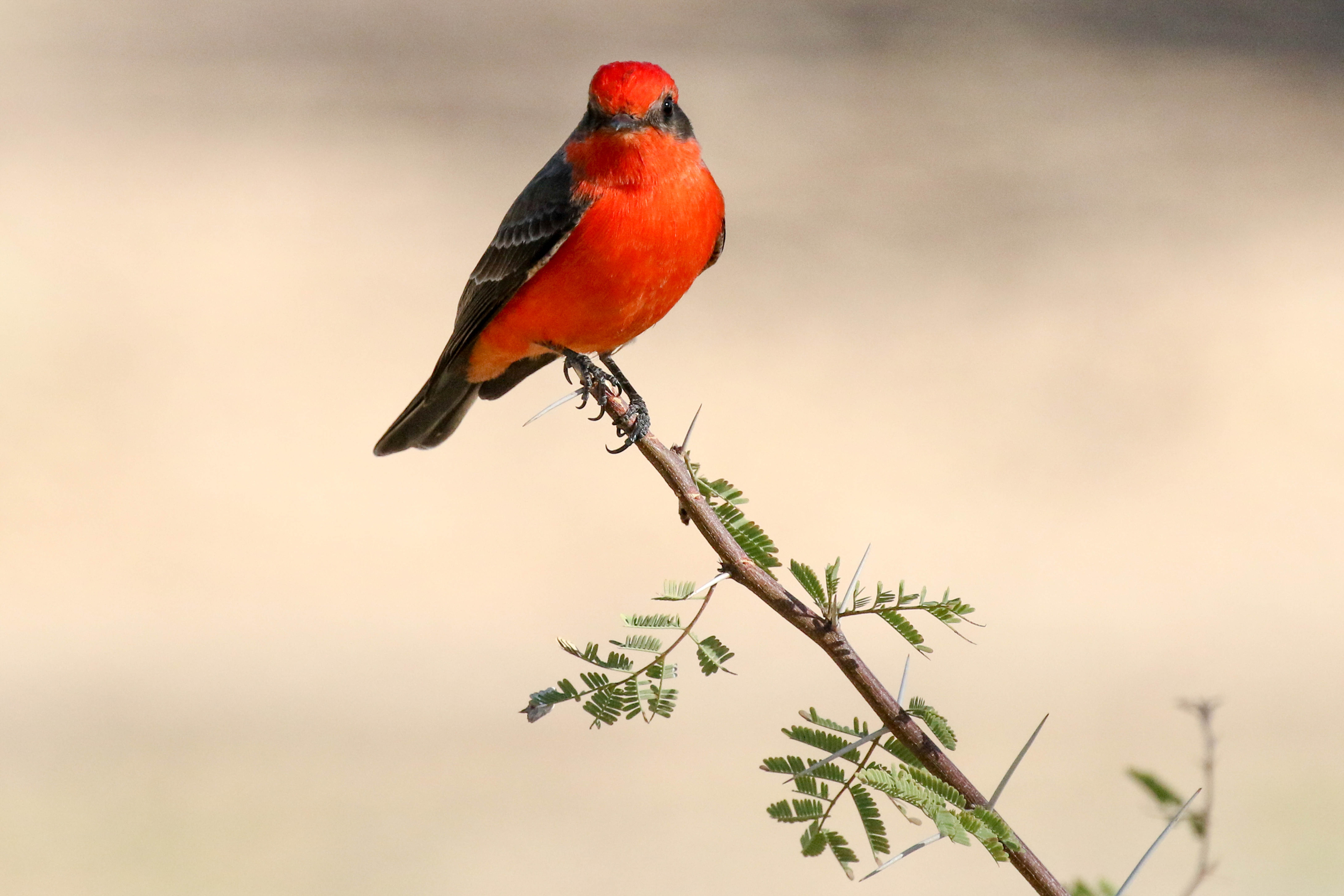 Vermilion Flycatcher sits on a tree branch