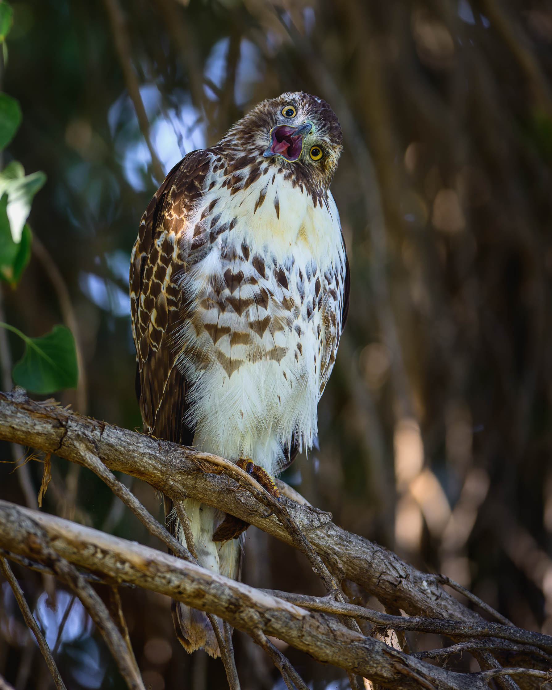 A Red-tailed hawk makes a funny face while on his perch in the tree.
