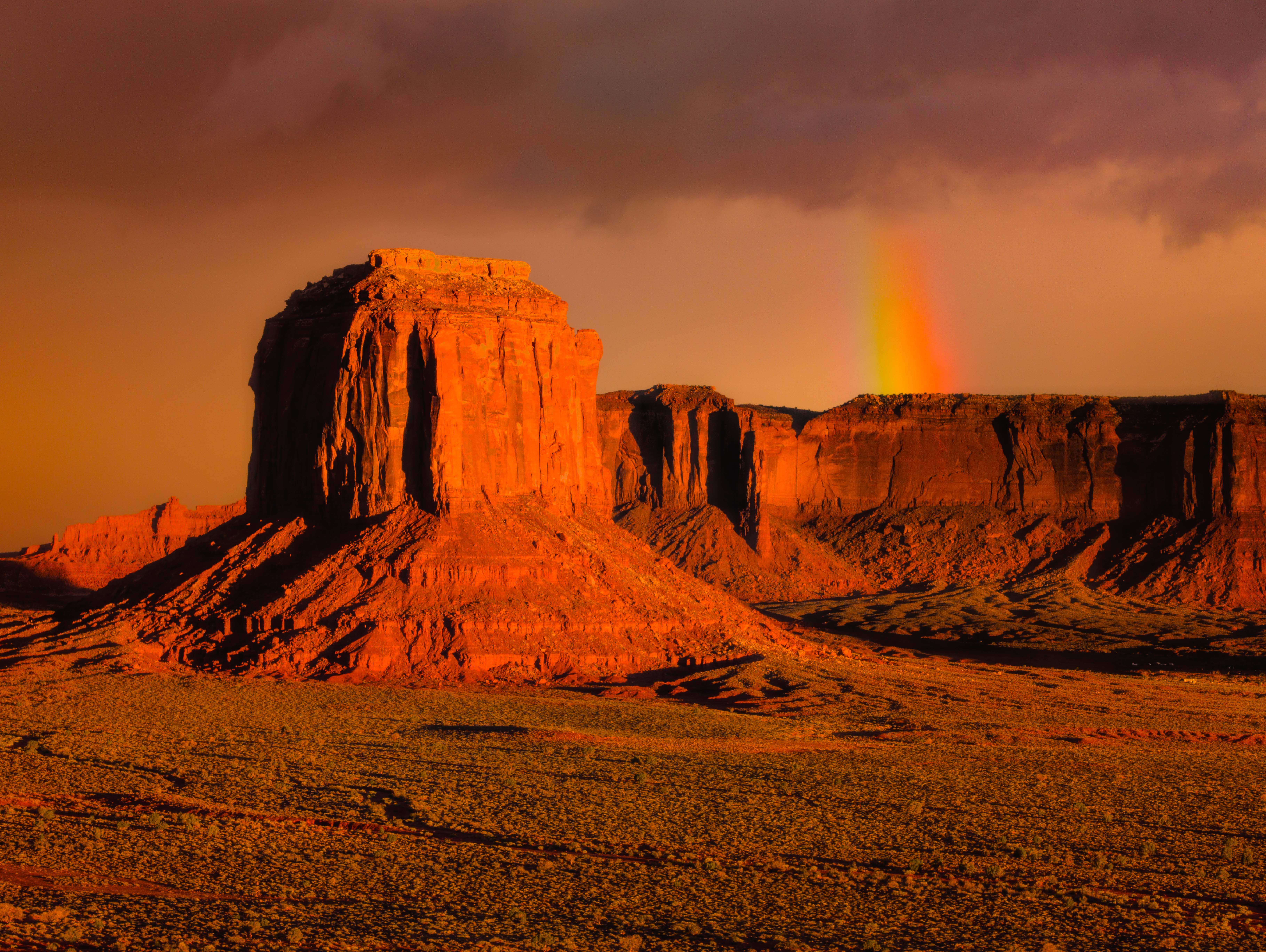 From Artist's Point, a fiery Monument Valley sunrise. A subtle rainbow graces Sentinel Mesa, adding a touch of ephemeral magic to the epic, glowing desert landscape