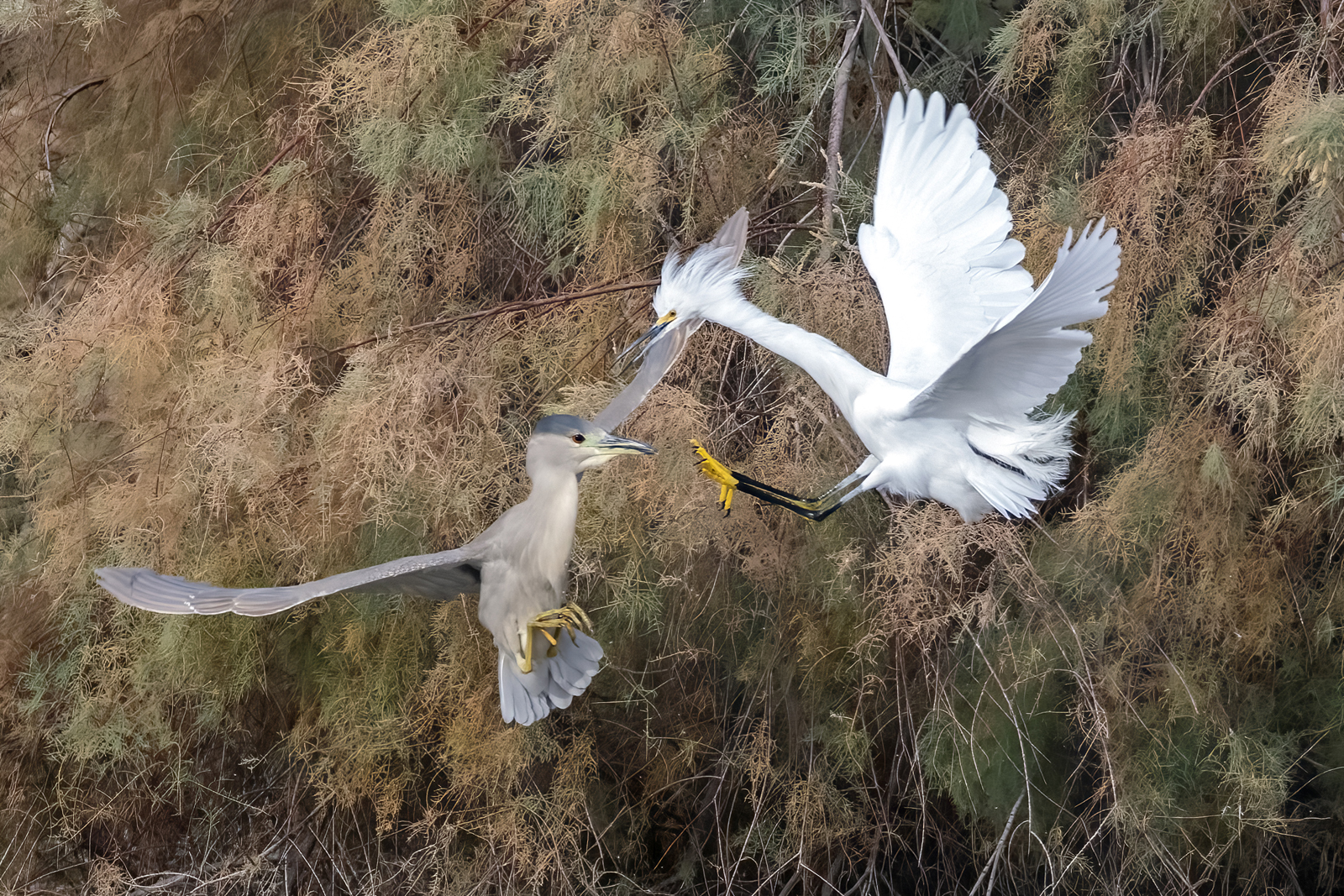 A Snowy Egret chases a Black-crowned Night Heron to keep it away from its lucrative fishing spot.