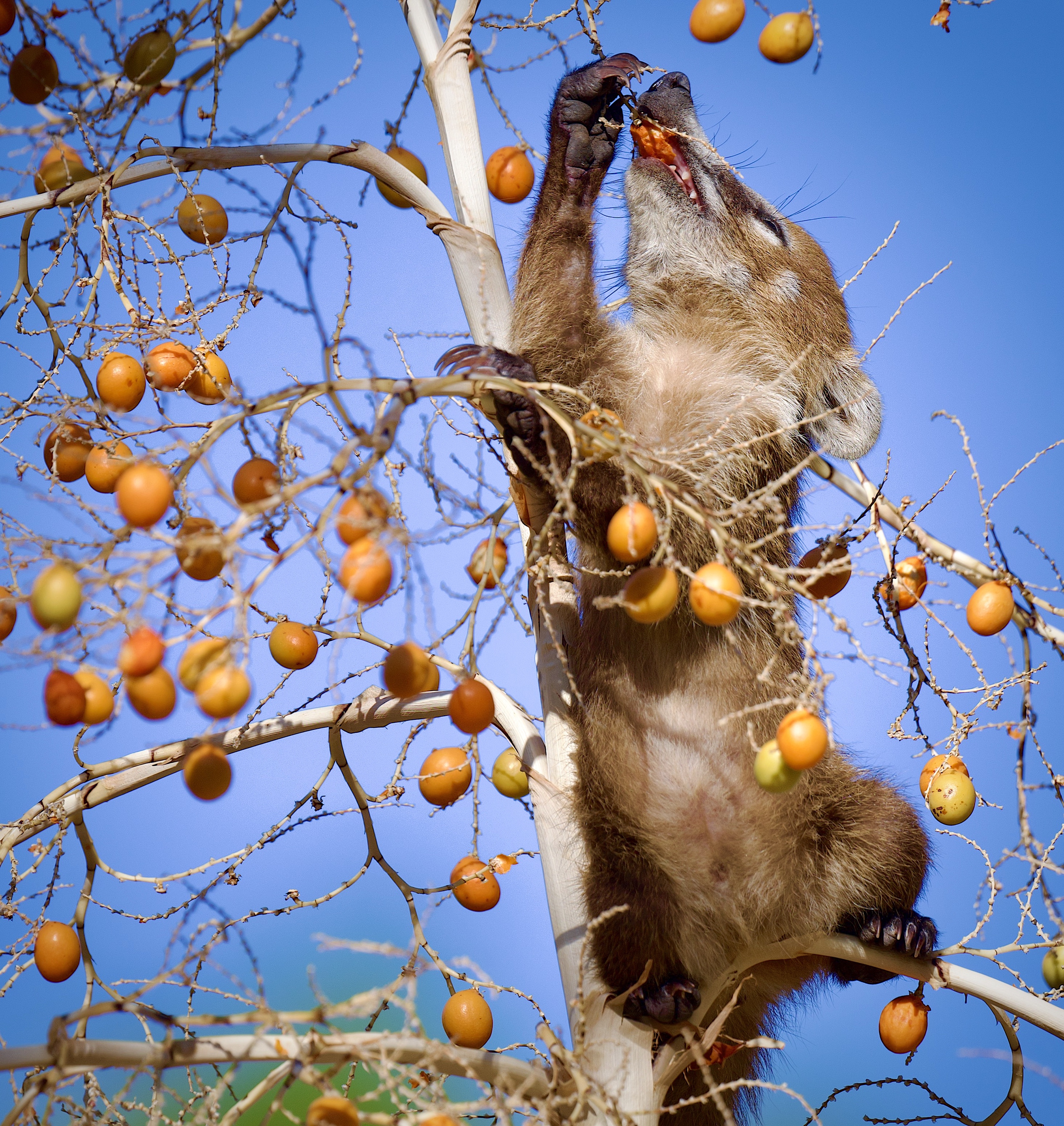 A Coatimundi baby enjoys it's Pindo Palm Tree fruit for breakfast ! YUM !