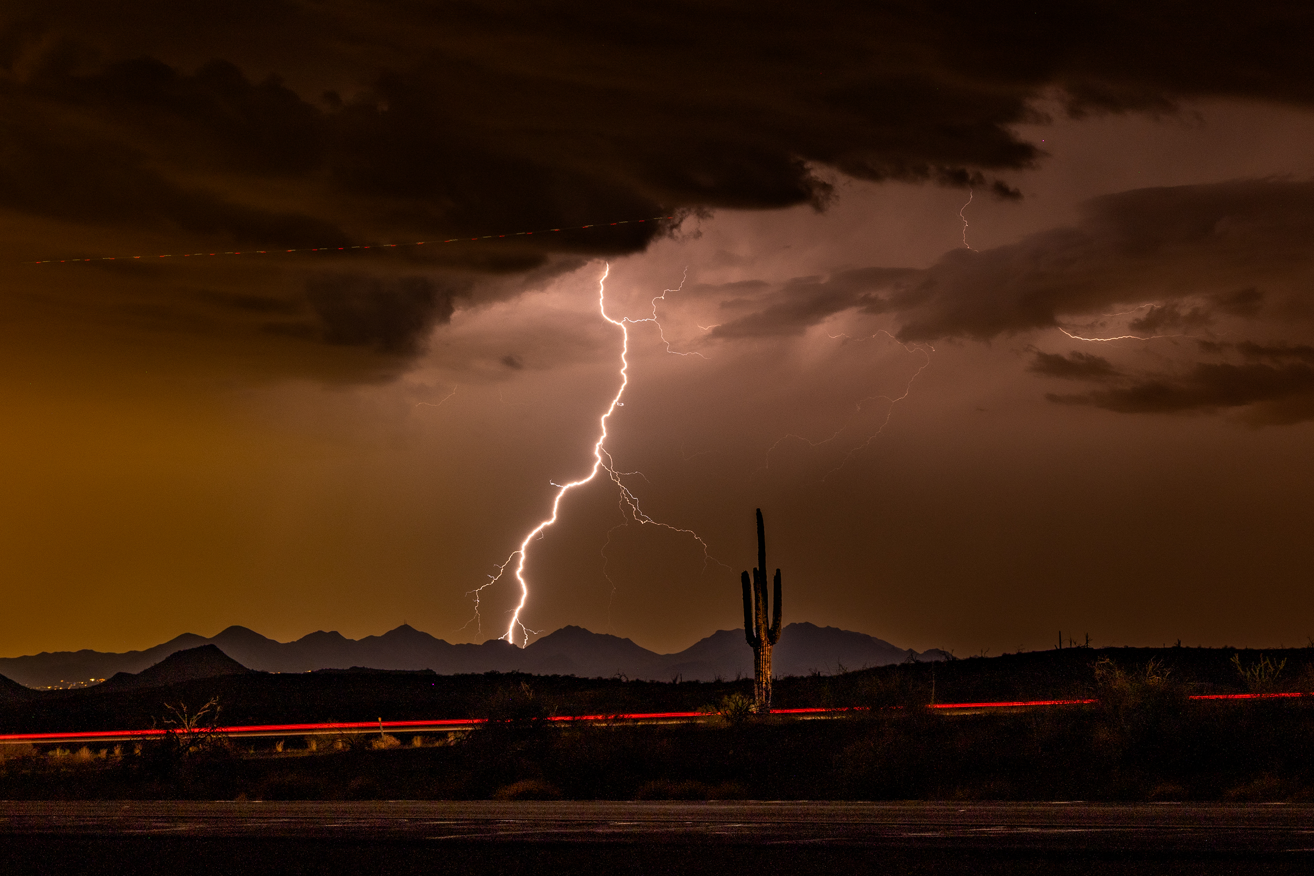 Lightning strikes the McDowells as cars pass a lone saguaro on the 87.
