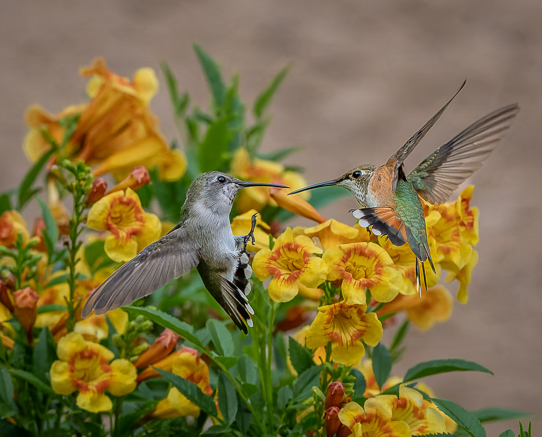 A hummingbird standoff at the Yellow Bells.