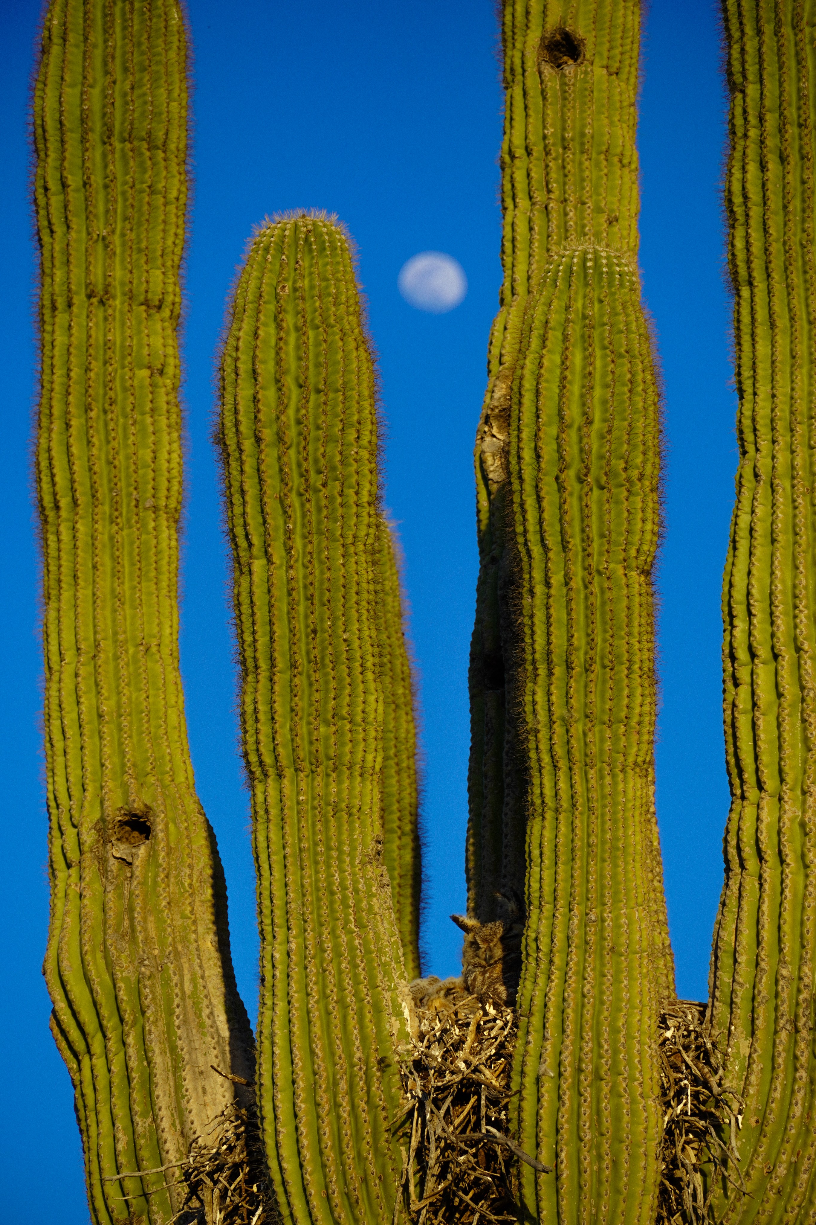Full moon over a great horned owl mother and owlet