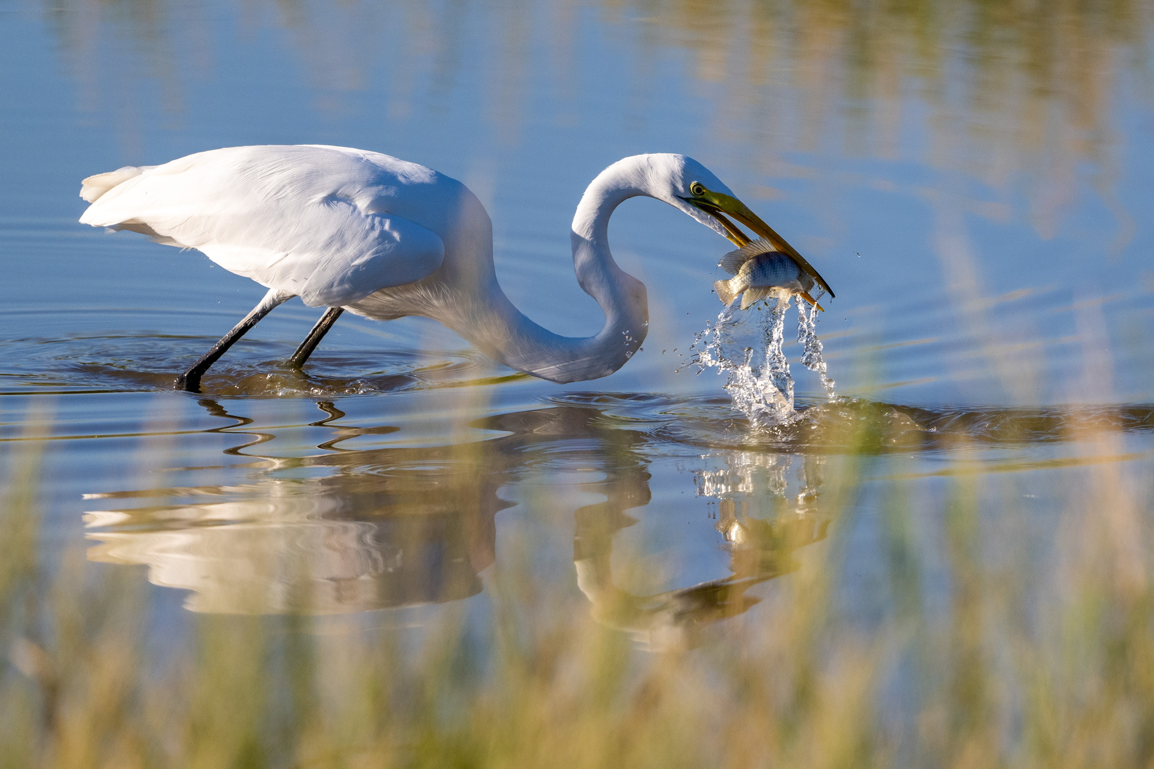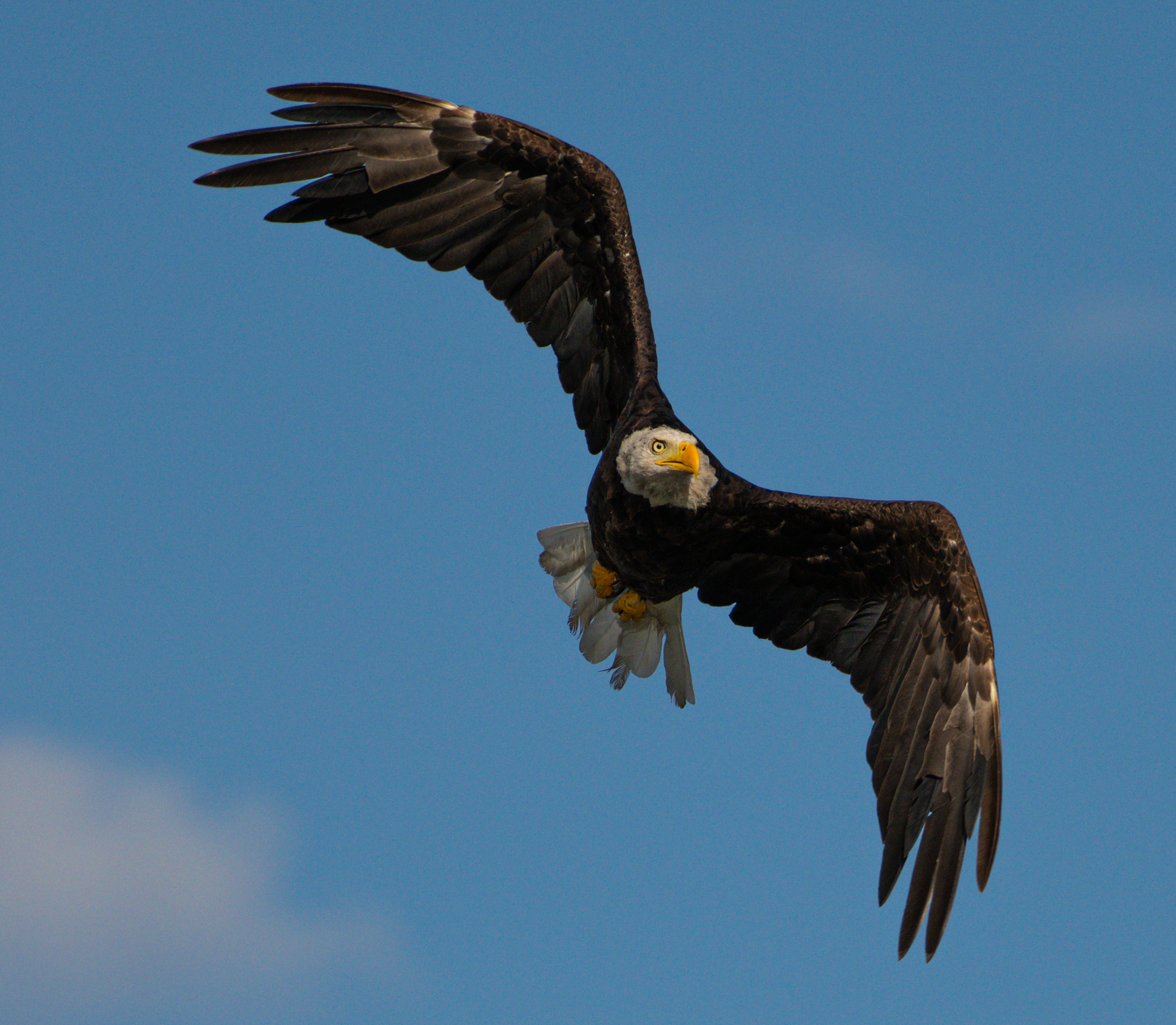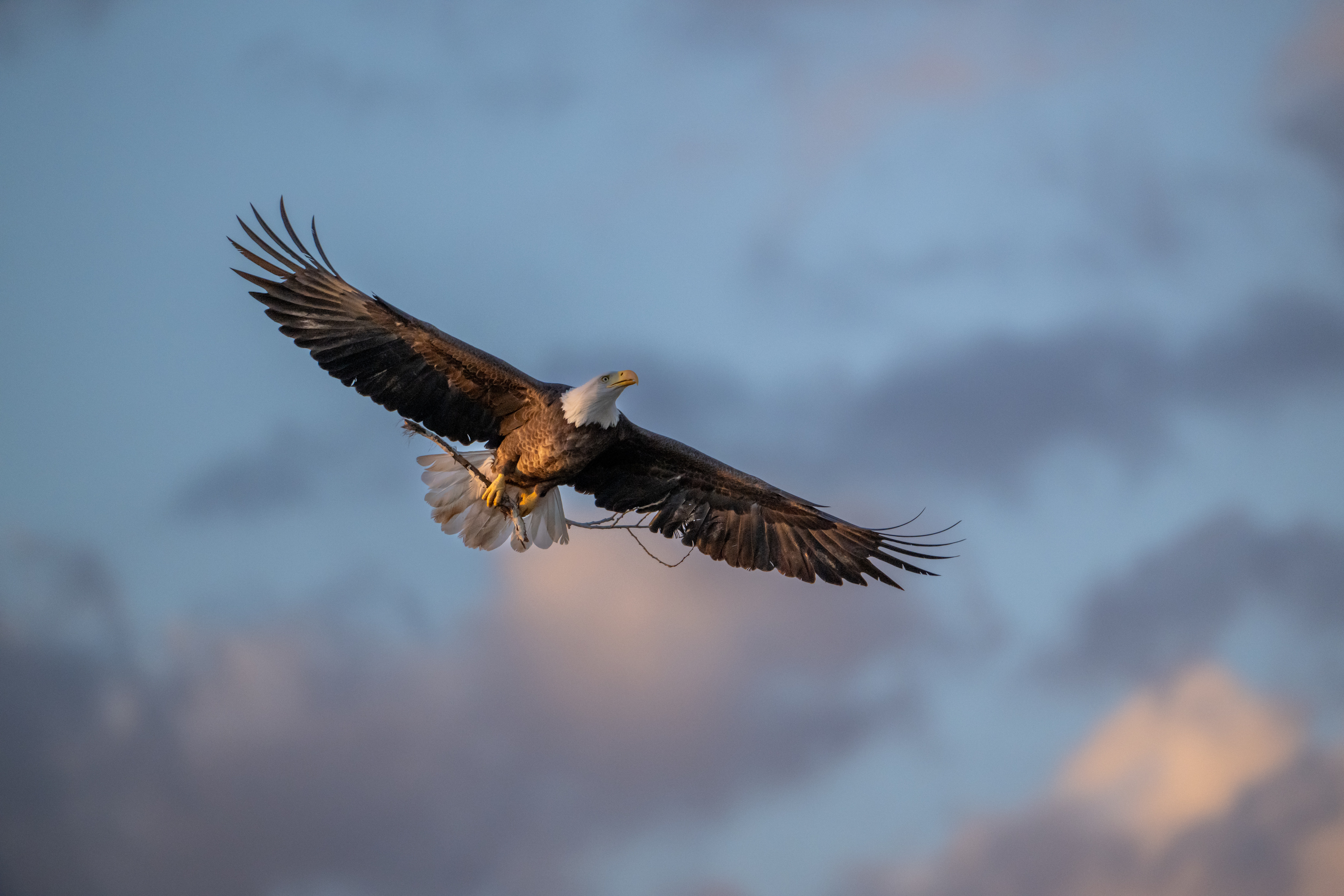 A female adult Bald Eagle gathering nesting material in the early morning light.