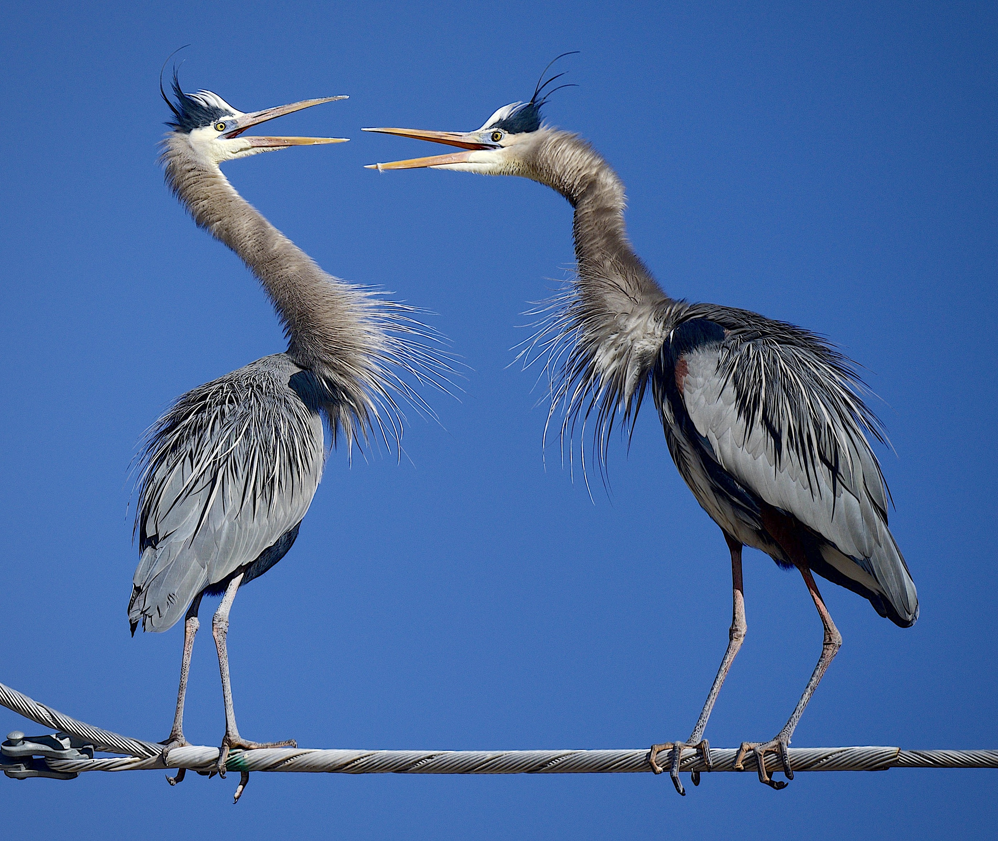 A Pair of Great Blue Herons having a heart to heart discussion on a power line !