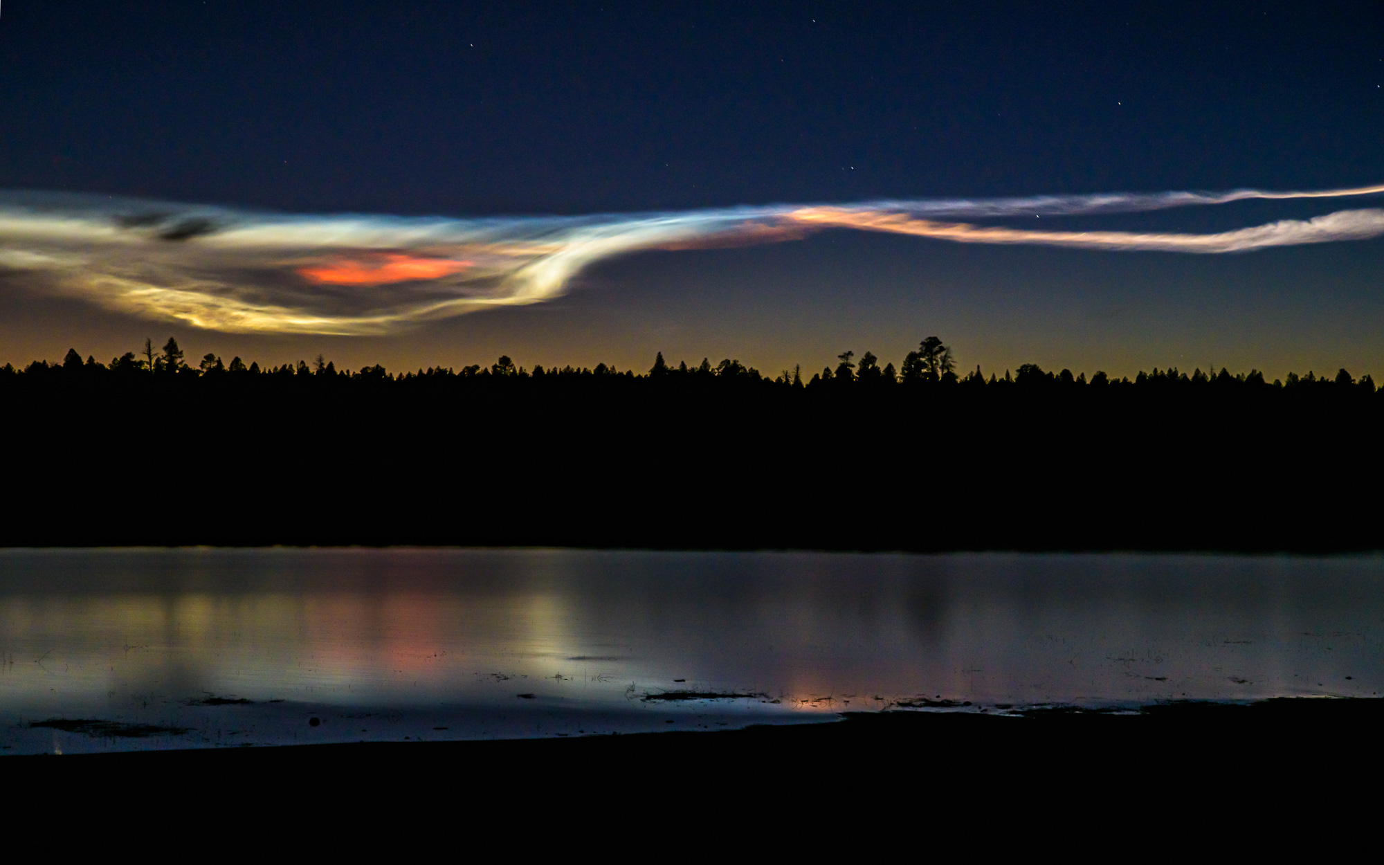 Rocket launches from the west coast during evening twilight can produce these colorful nacreous clouds that are easily seen from all of Arizona.
