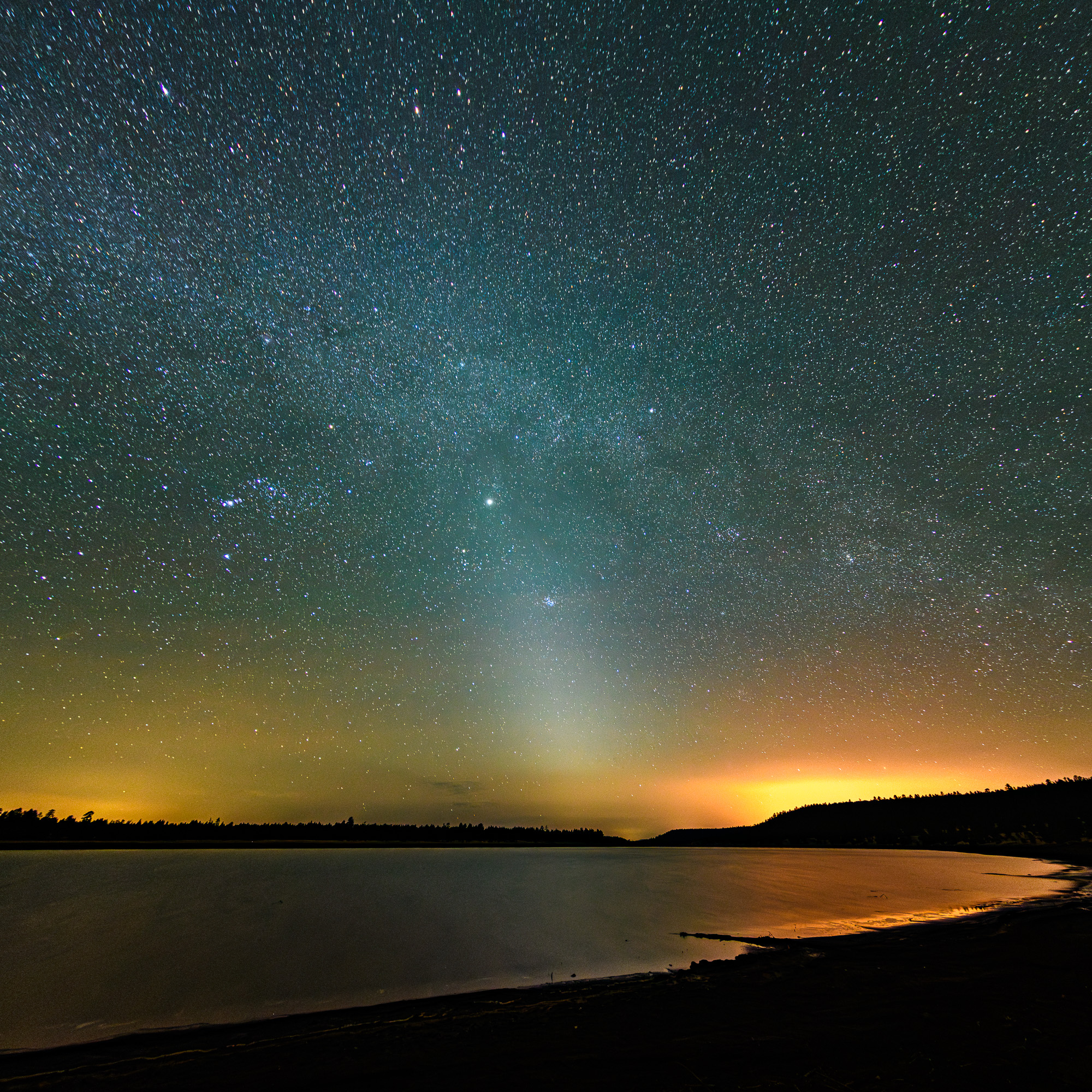 The nearly vertical band of the Zodiacal Light intersects the Milky Way in the western sky and is reflected in the waters of Upper Lake Mary.