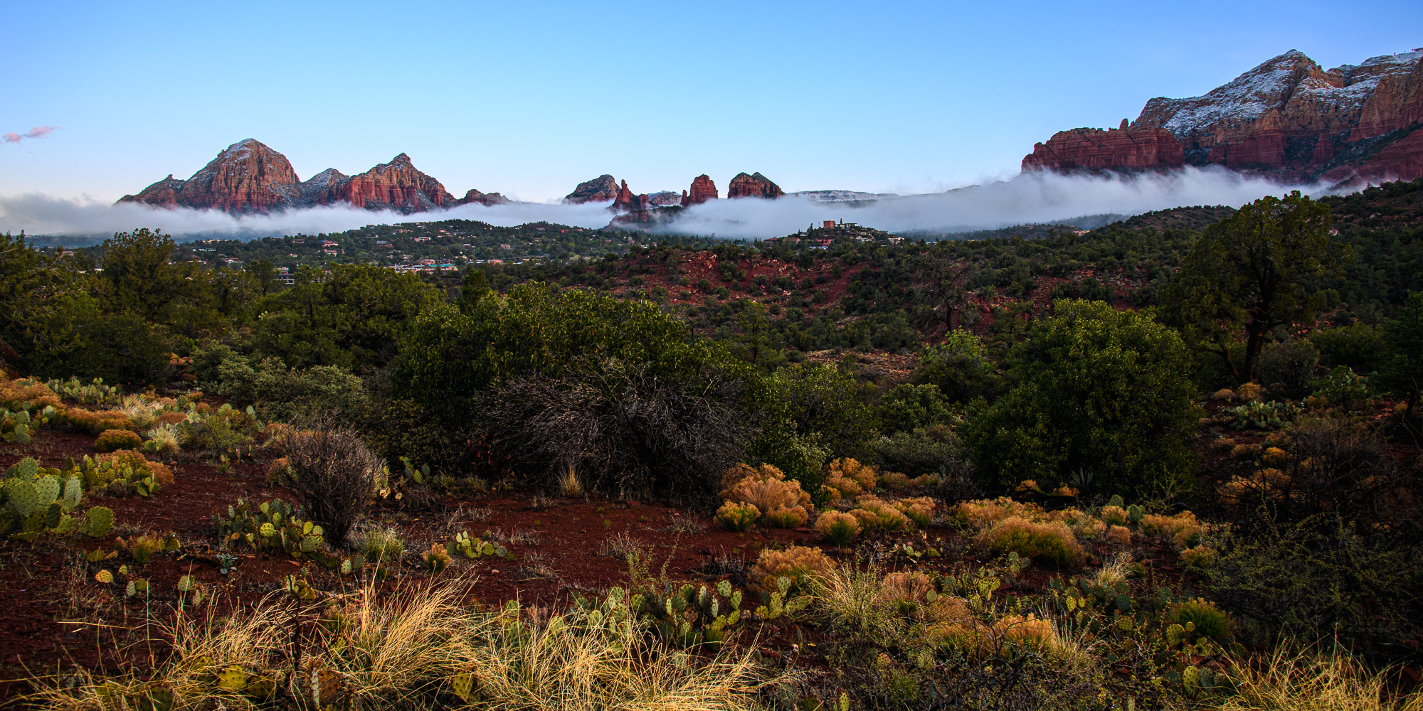 A departing spring storm leaves behind bands of fog that flow down Oak Creek Canyon and into Sedona in the early morning hours.