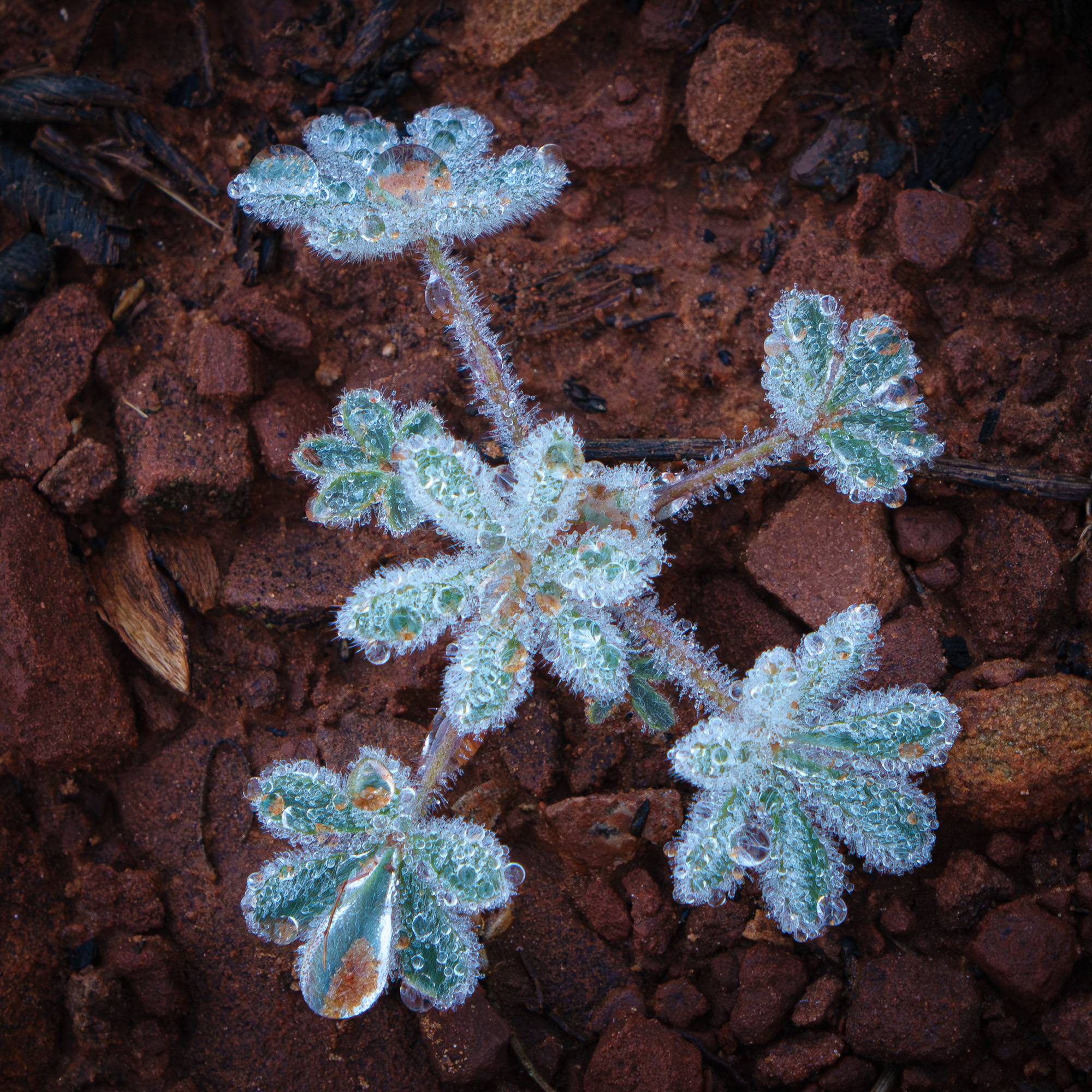 Tiny drops of dew adorn this small lupine plant located on Margs Draw Trail near Sedona, Arizona.