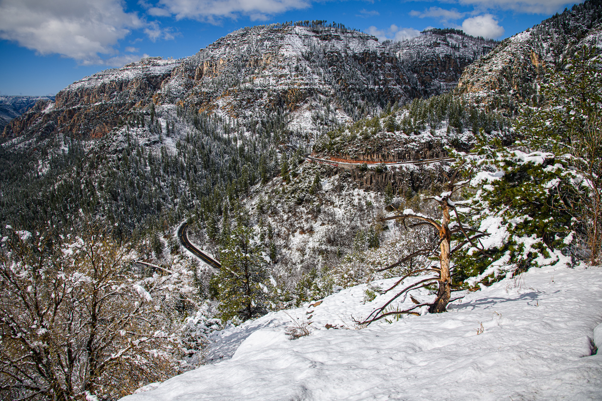 A spring storm brings snow to the high country including State Road 89A as it follows a series of switchbacks through the upper end of Oak Creek Canyon.