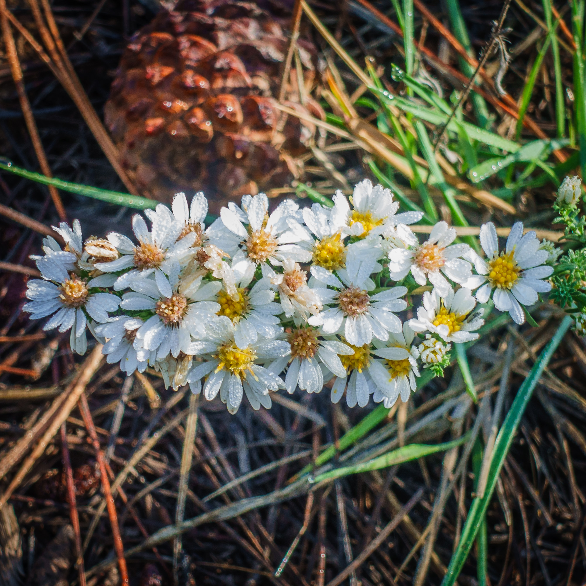 Morning dew adorns a cluster of white asters on the Highland Trail south of Fort Tuthill near Flagstaff, Arizona.