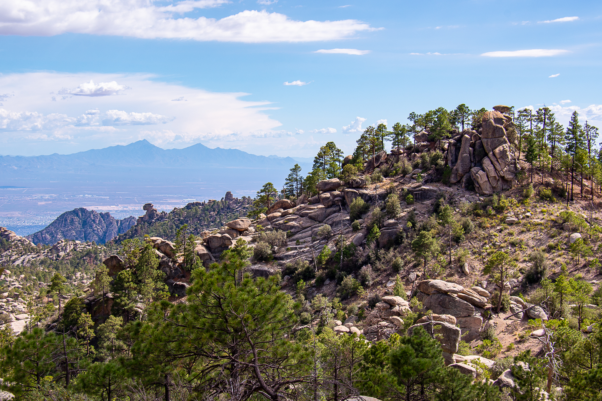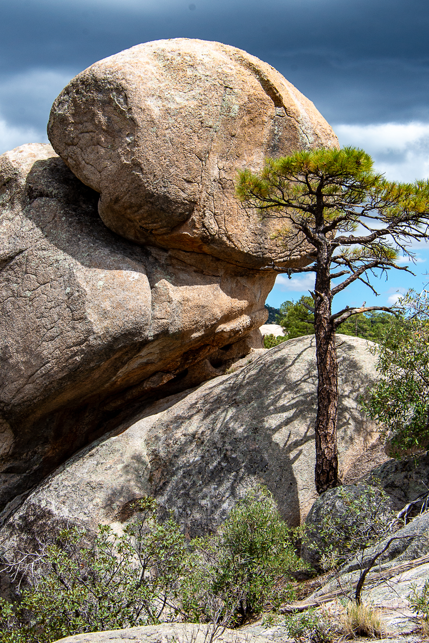 Pine tree growing next to a large boulder in the Wilderness of Rock on Mount Lemmon.