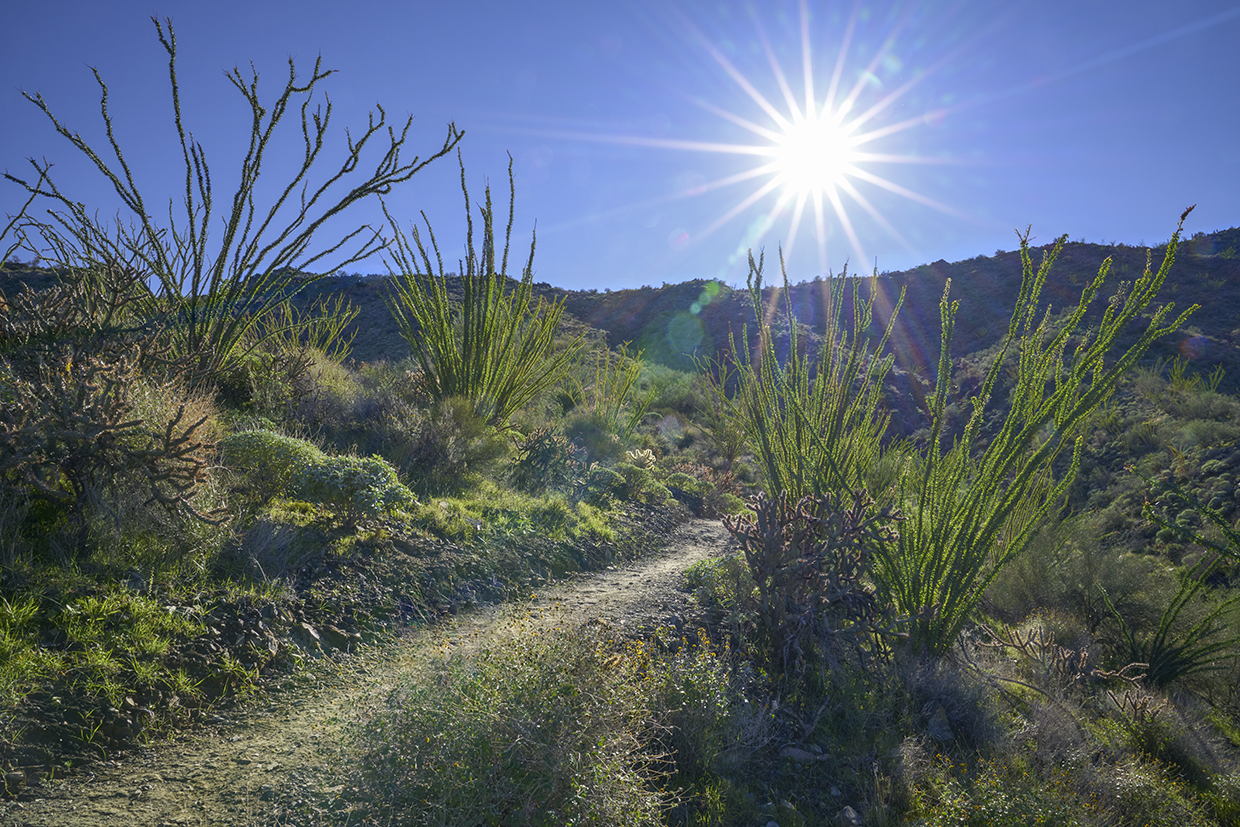 You might see some of them on this trail, which is a well-marked single-track surrounded at the outset by a regiment of beautiful ocotillos. Also known as flaming sword and Jacob’s staff, these large shrubs can reach heights of up to 20 feet. On this trail, some of them are pushing that extreme. They’re a highlight of the hike.