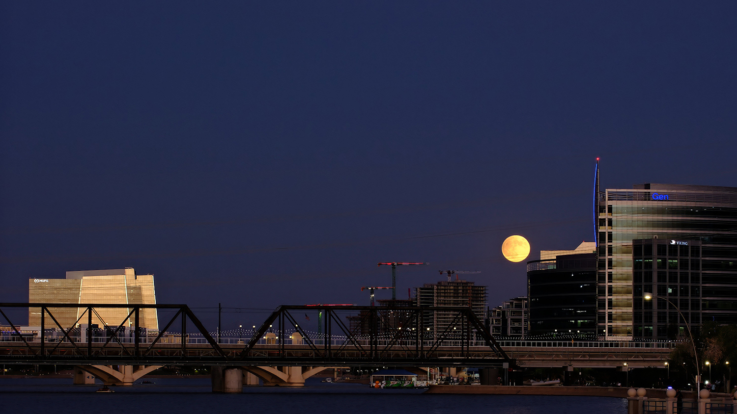 The moon rises over Tempe Town Lake, a Salt River reservoir just east of Phoenix.