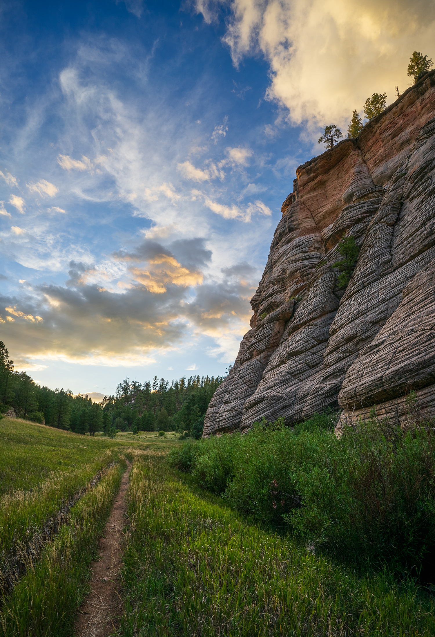 A towering stone wall rises from a verdant meadow at Fisher Point in the Coconino National Forest.